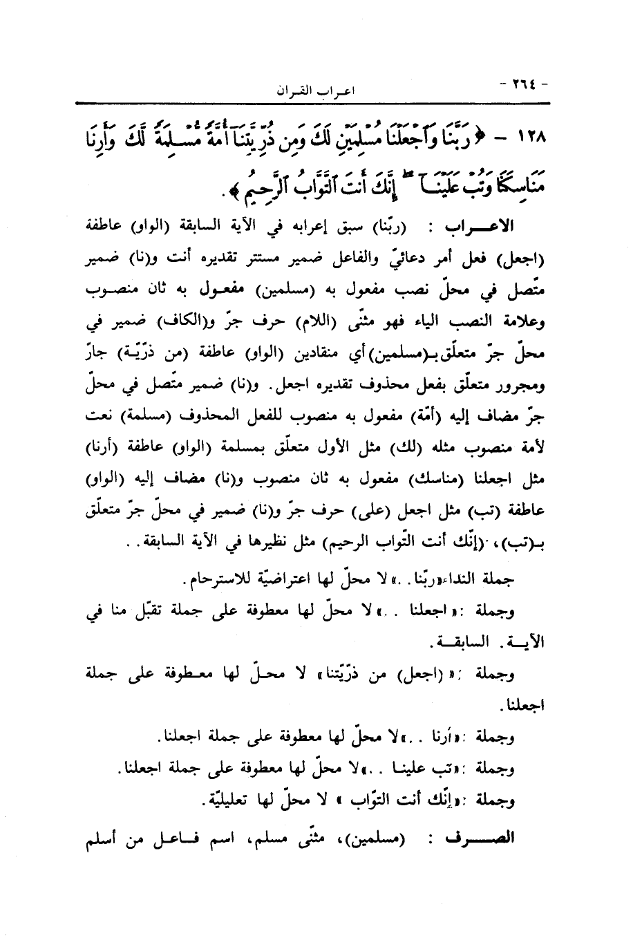 (ربّنا) سبق إعرابه في الآية السابقة (الواو) عاطفة (اجعل) فعل أمر دعائيّ والفاعل ضمير مستتر تقديره أنت و (نا) ضمير متّصل في محلّ نصب مفعول به (مسلمين) مفعول به ثان منصوب وعلامة النصب الياء فهو مثنّى (اللام) حرف جرّ و (الكاف) ضمير في محلّ جرّ متعلّق ب (مسلمين) أي منقادين (الواو) عاطفة (من ذرّيّة) جارّ ومجرور متعلّق بفعل محذوف تقديره اجعل. و (نا) ضمير متّصل في محلّ جرّ مضاف إليه (أمّة) مفعول به منصوب للفعل المحذوف (مسلمة) نعت لأمة منصوب مثله (لك) مثل الأول متعلّق بمسلمة (الواو) عاطفة (أرنا) مثل اجعلنا (مناسك) مفعول به ثان منصوب و (نا) مضاف إليه (الواو) عاطفة (تب) مثل اجعل (على) حرف جرّ و (نا) ضمير في محلّ جرّ متعلّق ب (تب) ، (إنّك أنت التّواب الرحيم) مثل نظيرها في الآية السابقة.