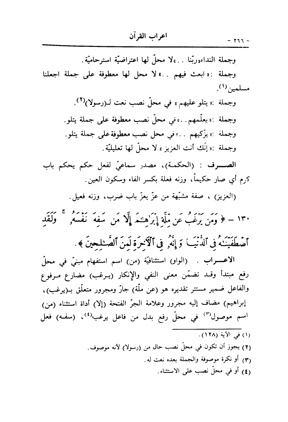 (الواو) استئنافيّة (من) اسم استفهام مبنيّ في محلّ رفع مبتدأ وقد تضمّن معنى النفي والإنكار (يرغب) مضارع مرفوع والفاعل ضمير مستتر تقديره هو (عن ملّة) جارّ ومجرور متعلّق ب (يرغب) ، (إبراهيم) مضاف إليه مجرور وعلامة الجرّ الفتحة (إلا) أداة استثناء (من) اسم موصول «3» في محلّ رفع بدل من فاعل يرغب «4» ، (سفه) فعل