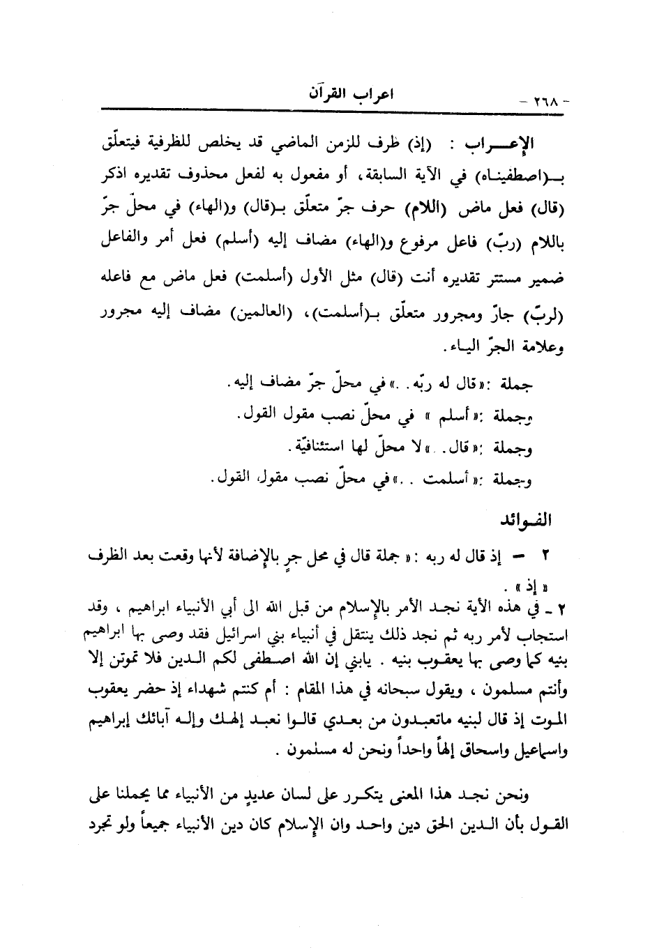 (إذ) ظرف للزمن الماضي قد يخلص للظرفية فيتعلّق ب (اصطفيناه) في الآية السابقة، أو مفعول به لفعل محذوف تقديره اذكر (قال) فعل ماض (اللام) حرف جرّ متعلّق ب (قال) و (الهاء) في محلّ جرّ باللام (ربّ) فاعل مرفوع و (الهاء) مضاف إليه (أسلم) فعل أمر والفاعل ضمير مستتر تقديره أنت (قال) مثل الأول (أسلمت) فعل ماض مع فاعله (لربّ) جارّ ومجرور متعلّق ب (أسلمت) ، (العالمين) مضاف إليه مجرور وعلامة الجرّ الياء.