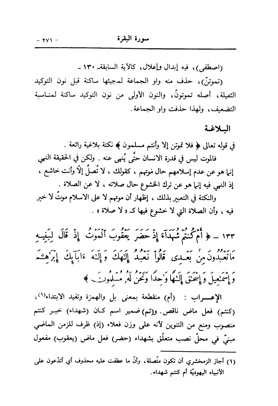 (أم) منقطعة بمعنى بل والهمزة وتفيد الابتداء «1» ، (كنتم) فعل ماض ناقص. و (تم) ضمير اسم كان (شهداء) خبر كنتم منصوب ومنع من التنوين لأنه على وزن فعلاء (إذ) ظرف للزمن الماضي مبنيّ في محلّ نصب متعلّق بشهداء (حضر) فعل ماض (يعقوب) مفعول
