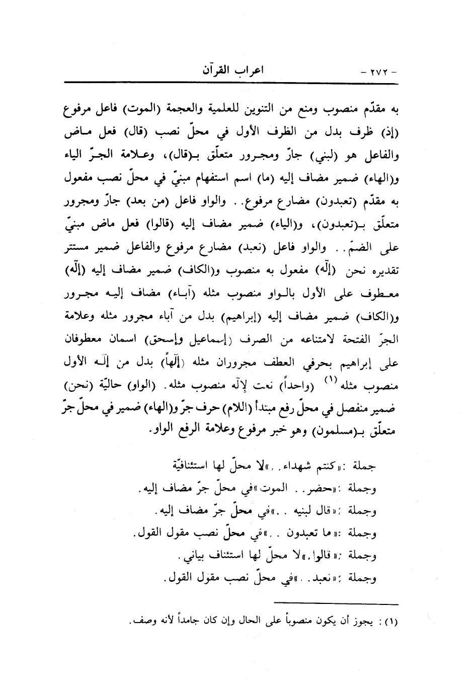 به مقدّم منصوب ومنع من التنوين للعلمية والعجمة (الموت) فاعل مرفوع (إذ) ظرف بدل من الظرف الأول في محلّ نصب (قال) فعل ماض والفاعل هو (لبني) جارّ ومجرور متعلّق ب (قال) ، وعلامة الجرّ الياء و (الهاء) ضمير مضاف إليه (ما) اسم استفهام مبنيّ في محلّ نصب مفعول به مقدّم (تعبدون) مضارع مرفوع.. والواو فاعل (من بعد) جارّ ومجرور متعلّق ب (تعبدون) ، و (الياء) ضمير مضاف إليه (قالوا) فعل ماض مبنيّ على الضمّ.. والواو فاعل (نعبد) مضارع مرفوع والفاعل ضمير مستتر تقديره نحن (إله) مفعول به منصوب و (الكاف) ضمير مضاف إليه (إله) معطوف على الأول بالواو منصوب مثله (آباء) مضاف إليه مجرور و (الكاف) ضمير مضاف إليه (إبراهيم) بدل من آباء مجرور مثله وعلامة الجرّ الفتحة لامتناعه من الصرف (إسماعيل وإسحاق) اسمان معطوفان على إبراهيم بحرفي العطف مجروران مثله (إلها) بدل من إله الأول منصوب مثله «1» (واحدا) نعت لإله منصوب مثله. (الواو) حاليّة (نحن) ضمير منفصل في محلّ رفع مبتدأ (اللام) حرف جرّ و (الهاء) ضمير في محلّ جرّ متعلّق ب (مسلمون) وهو خبر مرفوع وعلامة الرفع الواو.
