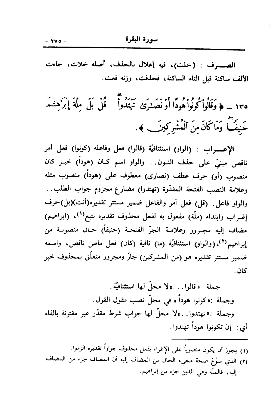 والواو فاعل. (قل) فعل أمر والفاعل ضمير مستتر تقديره (أنت) (بل) حرف إضراب وابتداء (ملّة) مفعول به لفعل محذوف تقديره نتبع «1» ، (إبراهيم) مضاف إليه مجرور وعلامة الجرّ الفتحة (حنيفا) حال منصوبة من إبراهيم «2» ، (والواو) استئنافيّة (ما) نافية (كان) فعل ماض ناقص، واسمه ضمير مستتر تقديره هو (من المشركين) جارّ ومجرور متعلّق بمحذوف خبر كان.