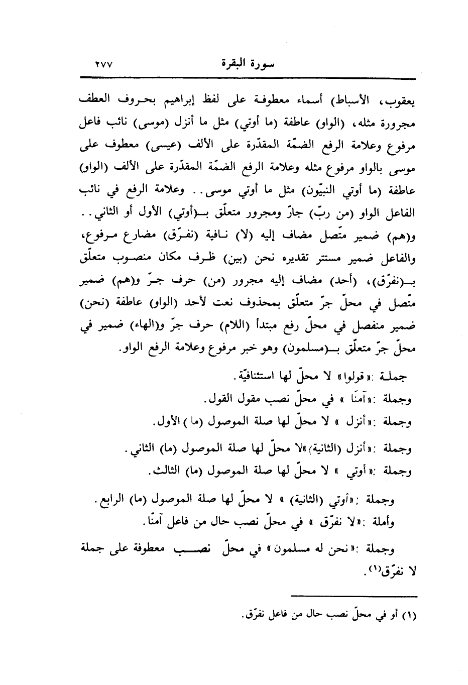 و (هم) ضمير متّصل مضاف إليه (لا) نافية (نفرّق) مضارع مرفوع، والفاعل ضمير مستتر تقديره نحن (بين) ظرف مكان منصوب متعلّق ب (نفرّق) ، (أحد) مضاف إليه مجرور (من) حرف جرّ و (هم) ضمير متّصل في محلّ جرّ متعلّق بمحذوف نعت لأحد (الواو) عاطفة (نحن) ضمير منفصل في محلّ رفع مبتدأ (اللام) حرف جرّ و (الهاء) ضمير في محلّ جرّ متعلّق ب (مسلمون) وهو خبر مرفوع وعلامة الرفع الواو.