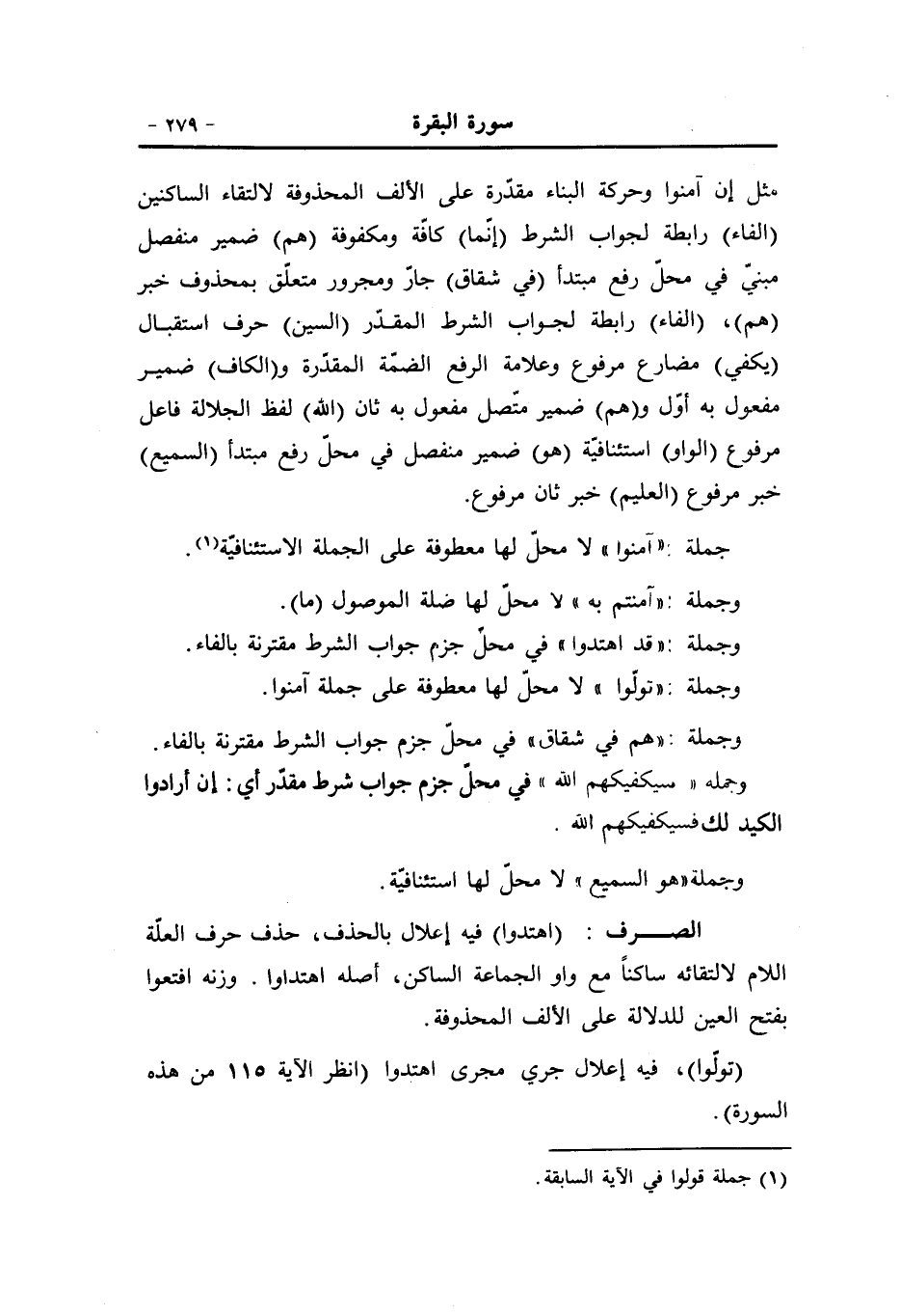 مثل إن آمنوا وحركة البناء مقدّرة على الألف المحذوفة لالتقاء الساكنين (الفاء) رابطة لجواب الشرط (إنّما) كافّة ومكفوفة (هم) ضمير منفصل مبنيّ في محلّ رفع مبتدأ (في شقاق) جارّ ومجرور متعلّق بمحذوف خبر (هم) ، (الفاء) رابطة لجواب الشرط المقدّر (السين) حرف استقبال (يكفي) مضارع مرفوع وعلامة الرفع الضمّة المقدّرة و (الكاف) ضمير مفعول به أوّل و (هم) ضمير متّصل مفعول به ثان (الله) لفظ الجلالة فاعل مرفوع (الواو) استئنافيّة (هو) ضمير منفصل في محلّ رفع مبتدأ (السميع) خبر مرفوع (العليم) خبر ثان مرفوع.