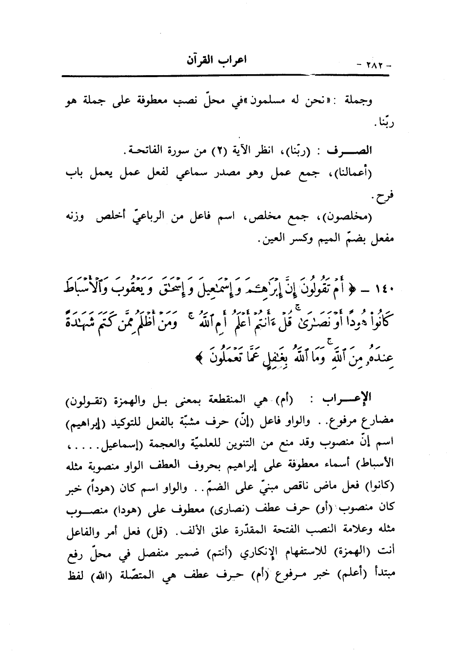الأسباط) أسماء معطوفة على إبراهيم بحروف العطف الواو منصوبة مثله (كانوا) فعل ماض ناقص مبنيّ على الضمّ.. والواو اسم كان (هودا) خبر كان منصوب (أو) حرف عطف (نصارى) معطوف على (هودا) منصوب مثله وعلامة النصب الفتحة المقدّرة علق الألف. (قل) فعل أمر والفاعل أنت (الهمزة) للاستفهام الإنكاري (أنتم) ضمير منفصل في محلّ رفع مبتدأ (أعلم) خبر مرفوع (أم) حرف عطف هي المتصّلة (الله) لفظ