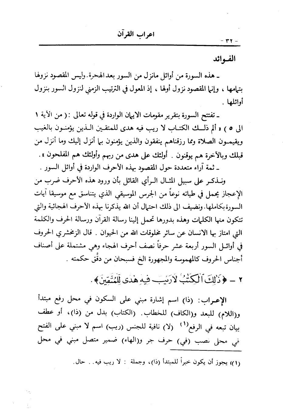 (ذا) اسم إشارة مبني على السكون في محل رفع مبتدأ و (اللام) للبعد و (الكاف) للخطاب. (الكتاب) بدل من (ذا) ، أو عطف بيان تبعه في الرفع «1» (لا) نافية للجنس (ريب) اسم لا مبني على الفتح في محل نصب (في) حرف جر و (الهاء) ضمير متصل مبني في محل