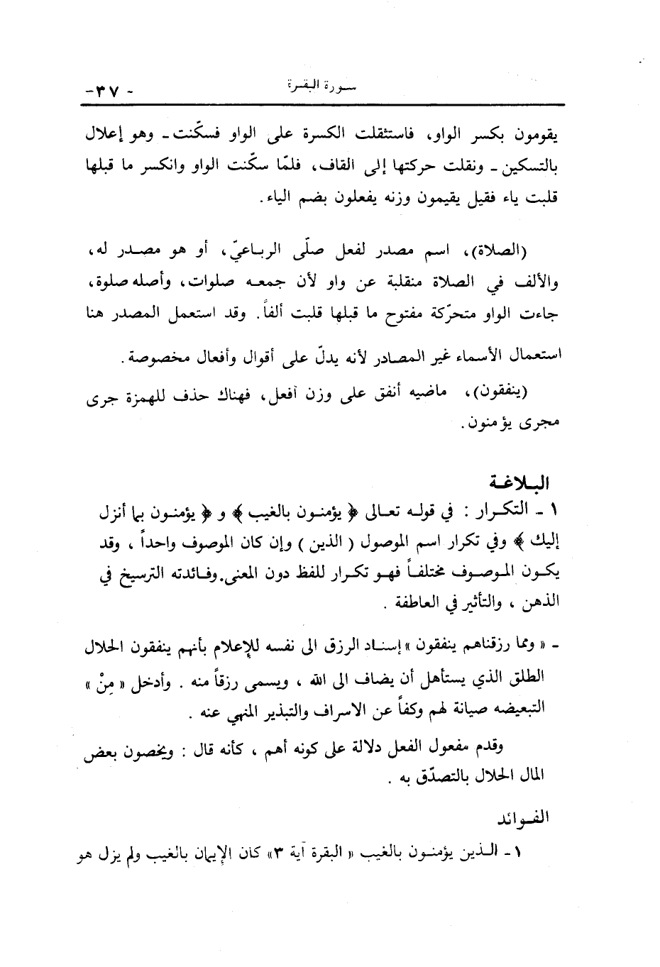 1- التكرار: في قوله تعالى يُؤْمِنُونَ بِالْغَيْبِ ويُؤْمِنُونَ بِما أُنْزِلَ إِلَيْكَ وفي تكرار اسم الموصول (الذين) وإن كان الموصوف واحدا، وقد يكون الموصوف مختلفا فهو تكرار للفظ دون المعنى. وفائدته الترسيخ في الذهن، والتأثير في العاطفة.