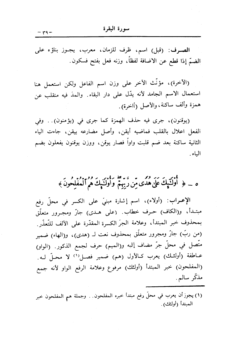 (من ربّ) جارّ ومجرور متعلّق بمحذوف نعت ل (هدى) ، و (الهاء) ضمير متّصل في محلّ جرّ مضاف إليه و (الميم) حرف لجمع الذكور. (الواو) عاطفة (أولئك) يعرب كالأول (هم) ضمير فصل «1» لا محلّ له.