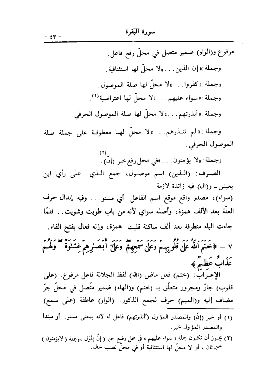 (2) يجوز أن تكون جملة «سواء عليهم» في محل رفع خبر (إنّ) أوّل، وجملة (لا يؤمنون) خبر ثان، أو لا محلّ لها استئنافية أو في محلّ نصب حال.