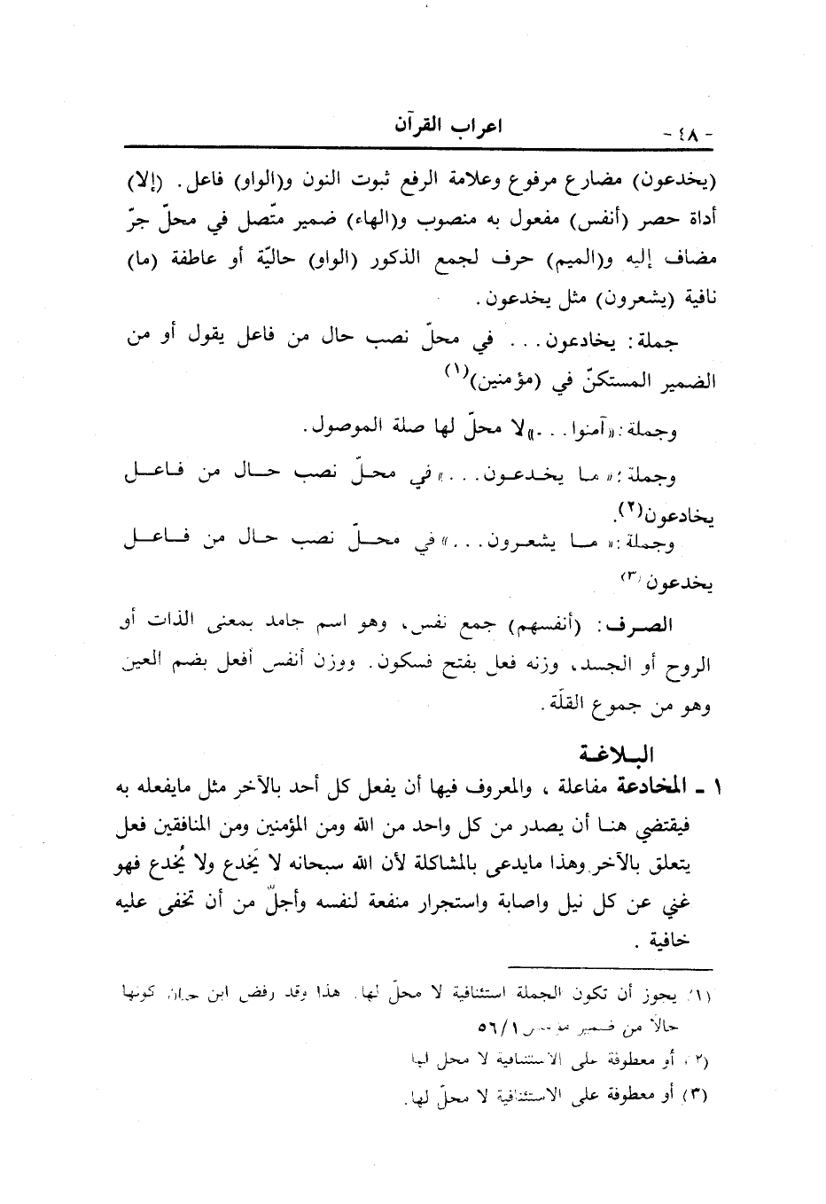 1- المخادعة مفاعلة، والمعروف فيها أن يفعل كل أحد بالآخر مثل ما يفعله به فيقتضي هنا أن يصدر من كل واحد من الله ومن المؤمنين ومن المنافقين فعل يتعلق بالآخر وهذا ما يدعى بالمشاكلة لأن الله سبحانه لا يخدع ولا يخدع فهو غني عن كل نيل واصابة واستجرار منفعة لنفسه وأجلّ من أن تخفى عليه خافية.