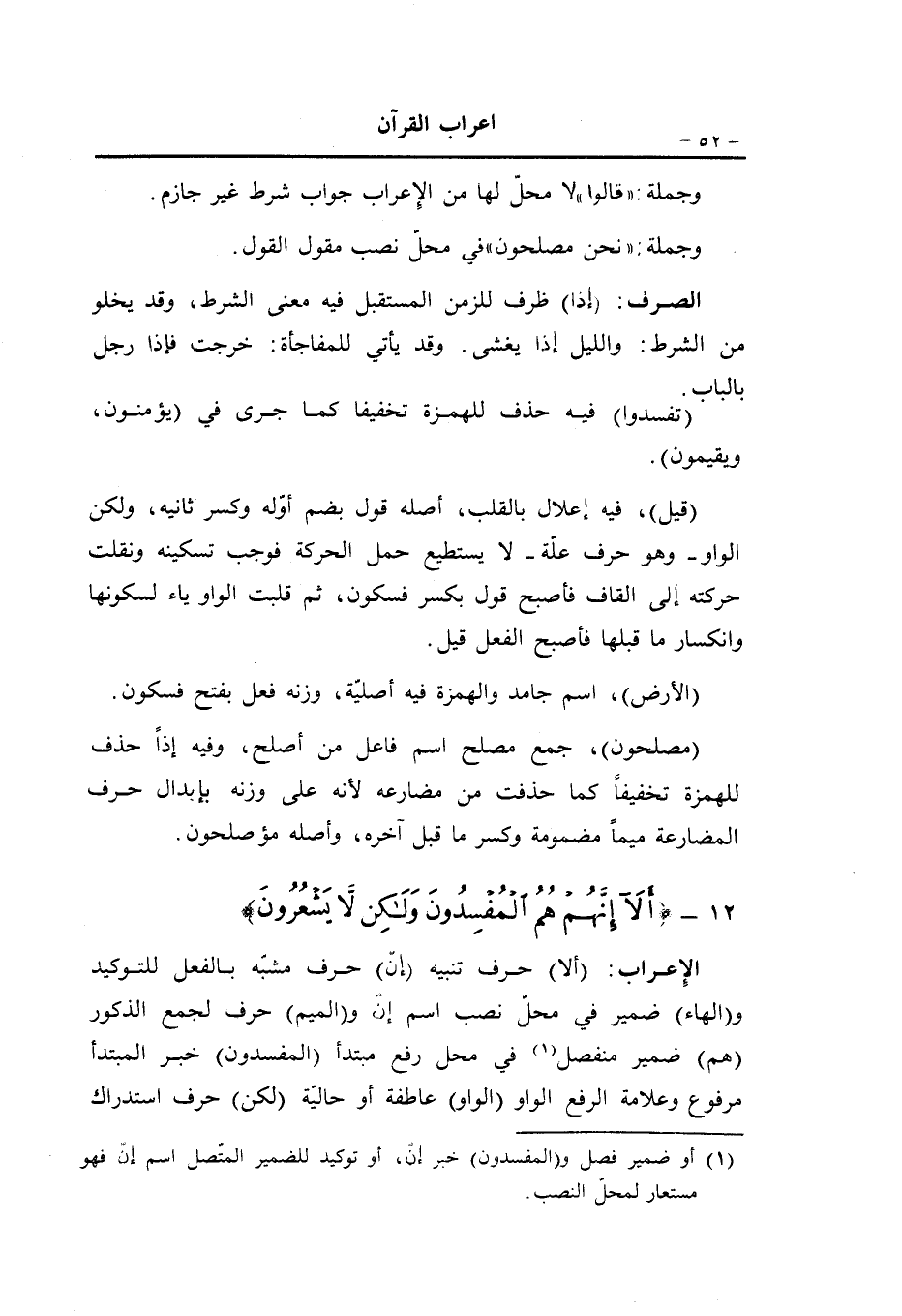 (ألا) حرف تنبيه (إنّ) حرف مشبّه بالفعل للتوكيد و (الهاء) ضمير في محلّ نصب اسم إنّ و (الميم) حرف لجمع الذكور (هم) ضمير منفصل «1» في محل رفع مبتدأ (المفسدون) خبر المبتدأ مرفوع وعلامة الرفع الواو (الواو) عاطفة أو حاليّة (لكن) حرف استدراك