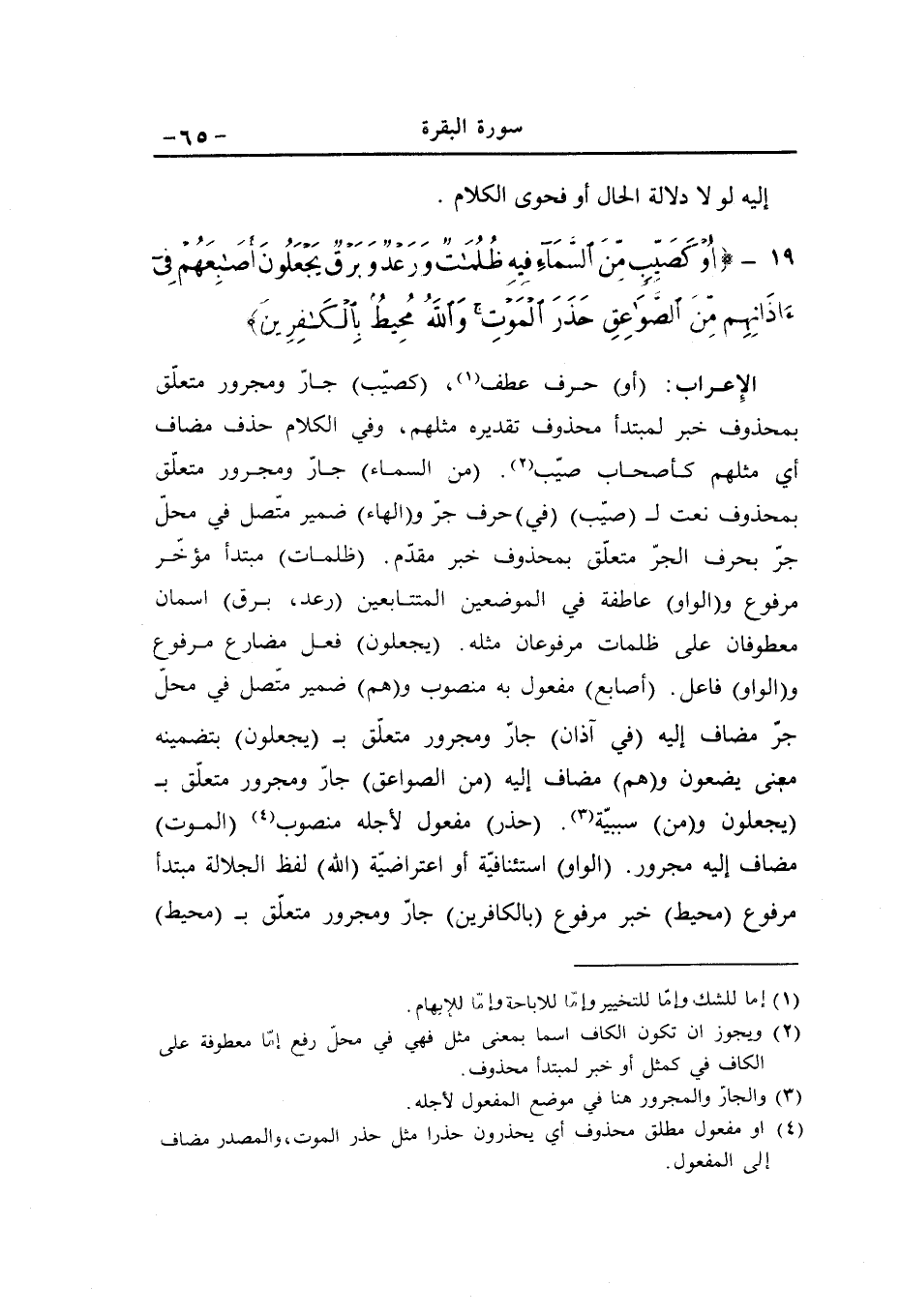 (أو) حرف عطف «1» ، (كصيّب) جارّ ومجرور متعلّق بمحذوف خبر لمبتدأ محذوف تقديره مثلهم، وفي الكلام حذف مضاف أي مثلهم كأصحاب صيّب «2» . (من السماء) جارّ ومجرور متعلّق بمحذوف نعت ل (صيّب) (في) حرف جرّ و (الهاء) ضمير متّصل في محلّ جرّ بحرف الجرّ متعلّق بمحذوف خبر مقدّم. (ظلمات) مبتدأ مؤخّر مرفوع و (الواو) عاطفة في الموضعين المتتابعين (رعد، برق) اسمان معطوفان على ظلمات مرفوعان مثله. (يجعلون) فعل مضارع مرفوع و (الواو) فاعل. (أصابع) مفعول به منصوب و (هم) ضمير متّصل في محلّ جرّ مضاف إليه (في آذان) جارّ ومجرور متعلّق ب (يجعلون) بتضمينه معنى يضعون و (هم) مضاف إليه (من الصواعق) جارّ ومجرور متعلّق ب (يجعلون) و (من) سببيّة «3» . (حذر) مفعول لأجله منصوب «4» (الموت) مضاف إليه مجرور. (الواو) استئنافيّة أو اعتراضيّة (الله) لفظ الجلالة مبتدأ مرفوع (محيط) خبر مرفوع (بالكافرين) جارّ ومجرور متعلّق ب (محيط)