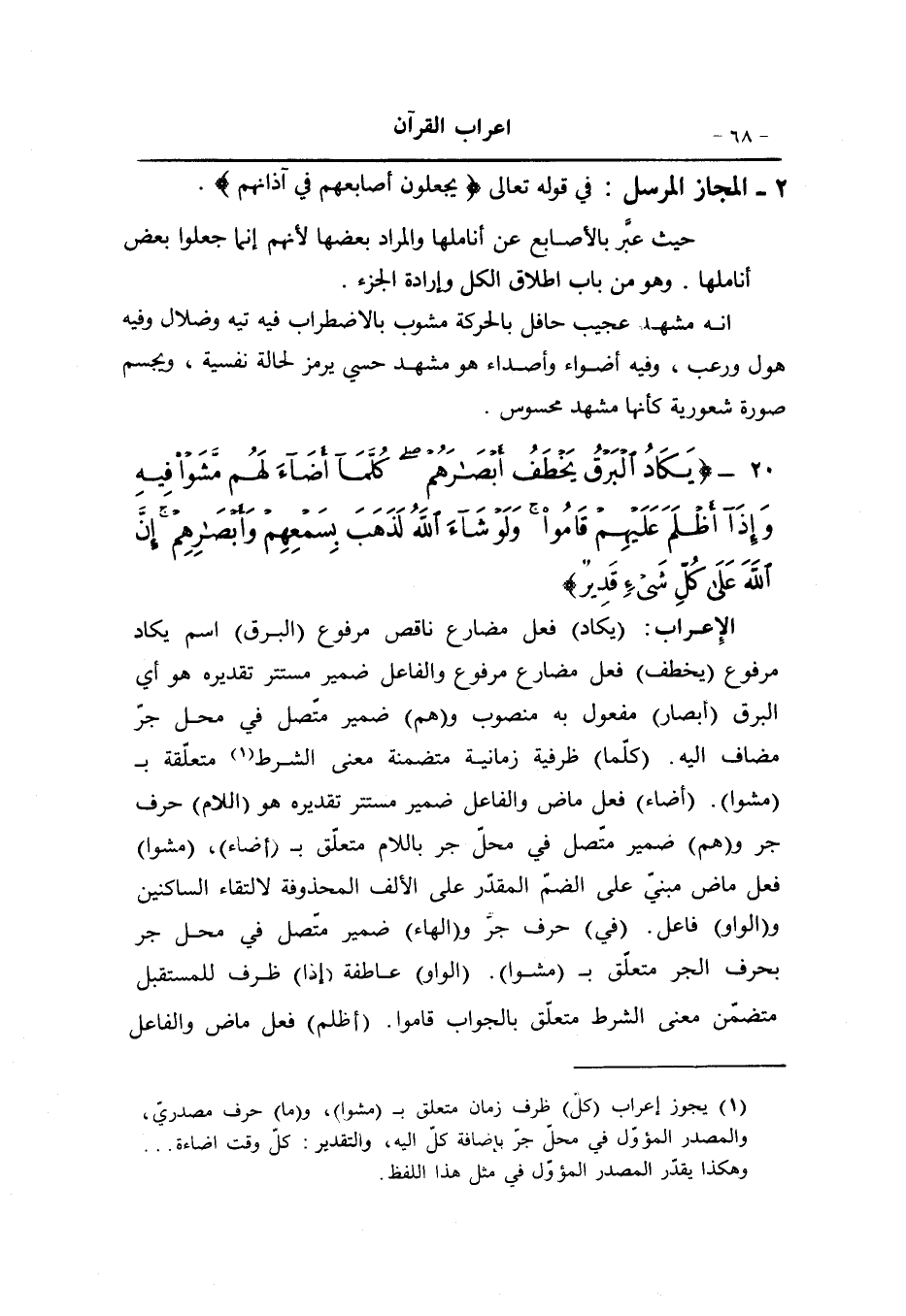 (1) يجوز إعراب (كلّ) ظرف زمان متعلق ب (مشوا) ، و (ما) حرف مصدريّ، والمصدر المؤوّل في محلّ جرّ بإضافة كلّ اليه، والتقدير: كلّ وقت اضاءة ...
