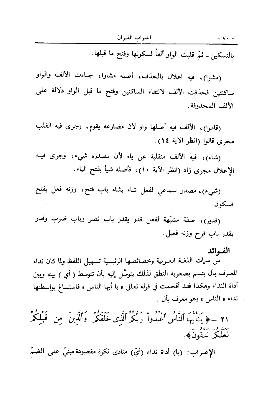 (مشوا) ، فيه اعلال بالحذف، أصله مشاوا، جاءت الألف والواو ساكنتين فحذفت الألف لالتقاء الساكنين وفتح ما قبل الواو دلالة على الألف المحذوفة.