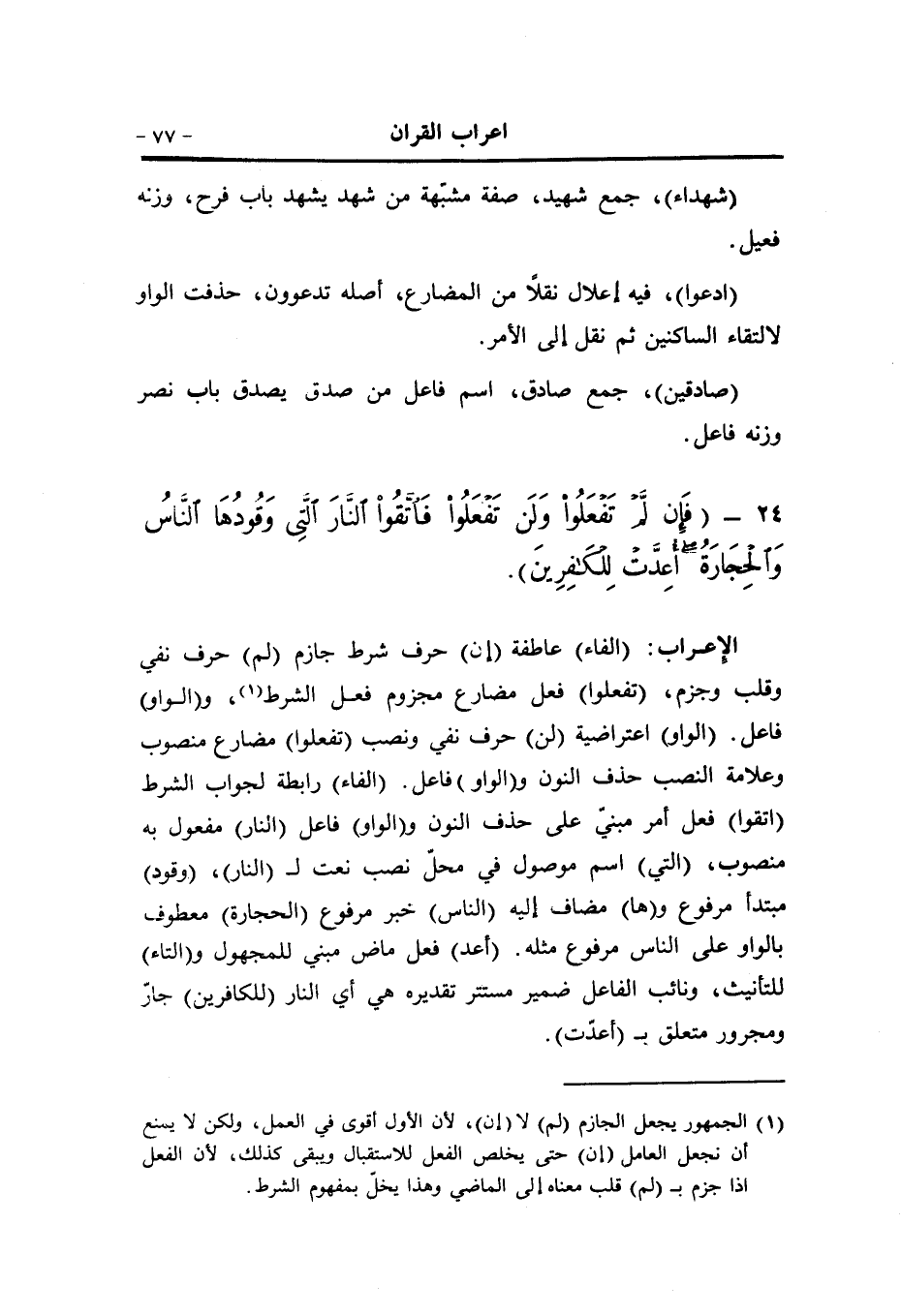 (الفاء) عاطفة (إن) حرف شرط جازم (لم) حرف نفي وقلب وجزم، (تفعلوا) فعل مضارع مجزوم فعل الشرط «1» ، و (الواو) فاعل. (الواو) اعتراضية (لن) حرف نفي ونصب (تفعلوا) مضارع منصوب وعلامة النصب حذف النون و (الواو) فاعل. (الفاء) رابطة لجواب الشرط (اتقوا) فعل أمر مبنيّ على حذف النون و (الواو) فاعل (النار) مفعول به منصوب، (التي) اسم موصول في محلّ نصب نعت ل (النار) ، (وقود) مبتدأ مرفوع و (ها) مضاف إليه (الناس) خبر مرفوع (الحجارة) معطوف بالواو على الناس مرفوع مثله. (أعد) فعل ماض مبني للمجهول و (التاء) للتأنيث، ونائب الفاعل ضمير مستتر تقديره هي أي النار (للكافرين) جارّ ومجرور متعلق ب (أعدّت) .