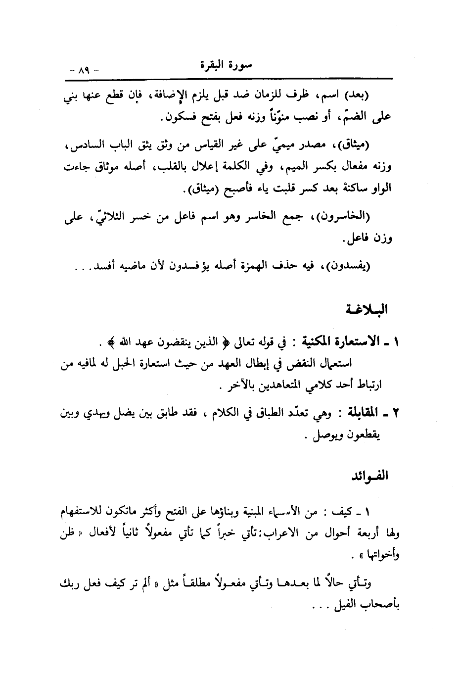2- المقابلة: وهي تعدّد الطباق في الكلام، فقد طابق بين يضل ويهدي وبين يقطعون ويوصل.
