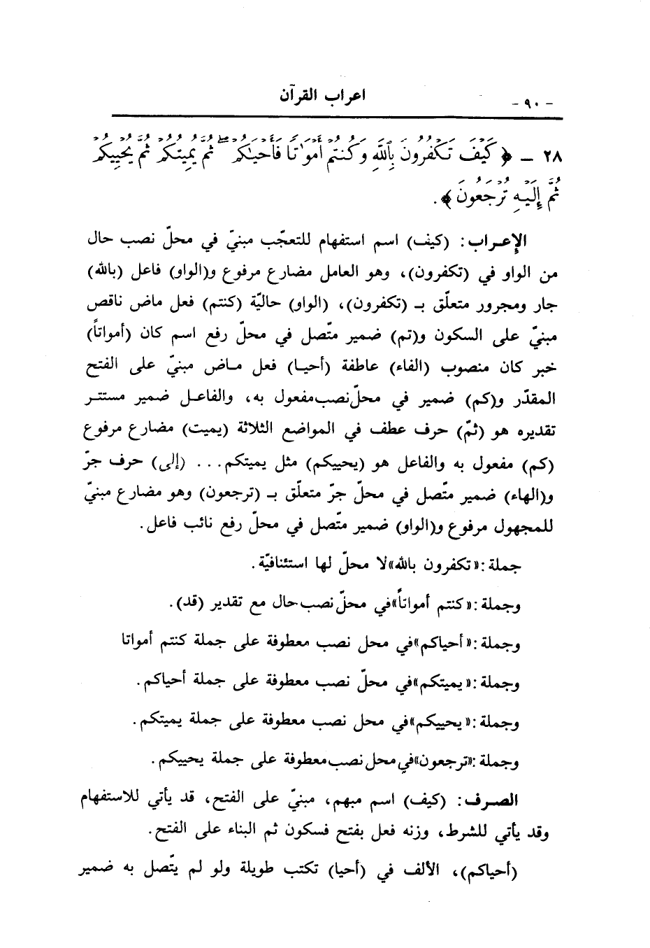(كيف) اسم استفهام للتعجّب مبنيّ في محلّ نصب حال من الواو في (تكفرون) ، وهو العامل مضارع مرفوع و (الواو) فاعل (بالله) جار ومجرور متعلّق ب (تكفرون) ، (الواو) حاليّة (كنتم) فعل ماض ناقص مبنيّ على السكون و (تم) ضمير متّصل في محلّ رفع اسم كان (أمواتا) خبر كان منصوب (الفاء) عاطفة (أحيا) فعل ماض مبنيّ على الفتح المقدّر و (كم) ضمير في محلّ نصب مفعول به، والفاعل ضمير مستتر تقديره هو (ثمّ) حرف عطف في المواضع الثلاثة (يميت) مضارع مرفوع (كم) مفعول به والفاعل هو (يحييكم) مثل يميتكم ... (إلى) حرف جرّ و (الهاء) ضمير متّصل في محلّ جرّ متعلّق ب (ترجعون) وهو مضارع مبنيّ للمجهول مرفوع و (الواو) ضمير متّصل في محلّ رفع نائب فاعل.