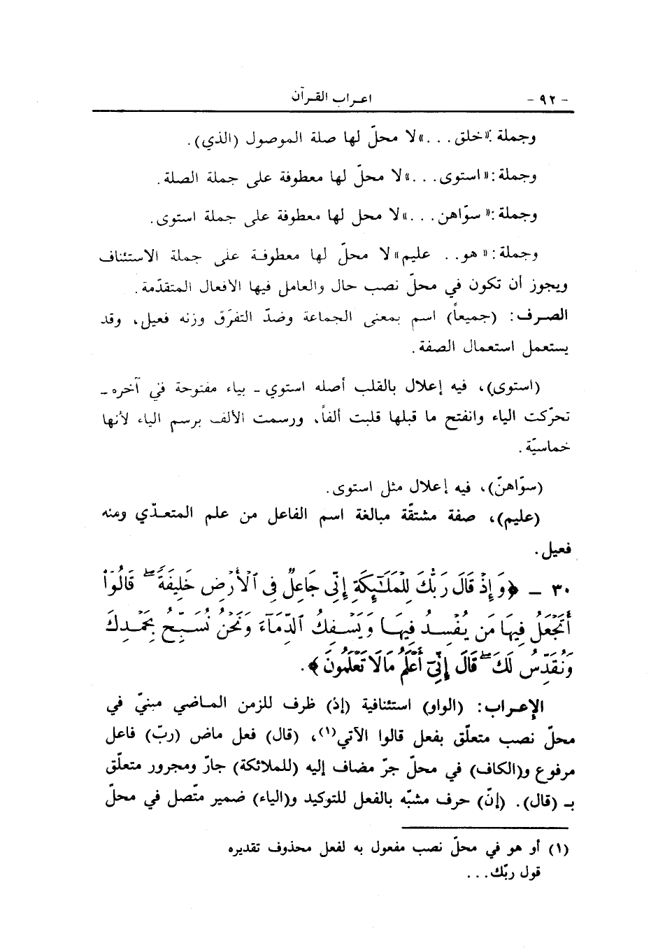 (الواو) استئنافية (إذ) ظرف للزمن الماضي مبنيّ في محلّ نصب متعلّق بفعل قالوا الآتي «1» ، (قال) فعل ماض (ربّ) فاعل مرفوع و (الكاف) في محلّ جرّ مضاف إليه (للملائكة) جارّ ومجرور متعلّق ب (قال) . (إنّ) حرف مشبّه بالفعل للتوكيد و (الياء) ضمير متّصل في محلّ