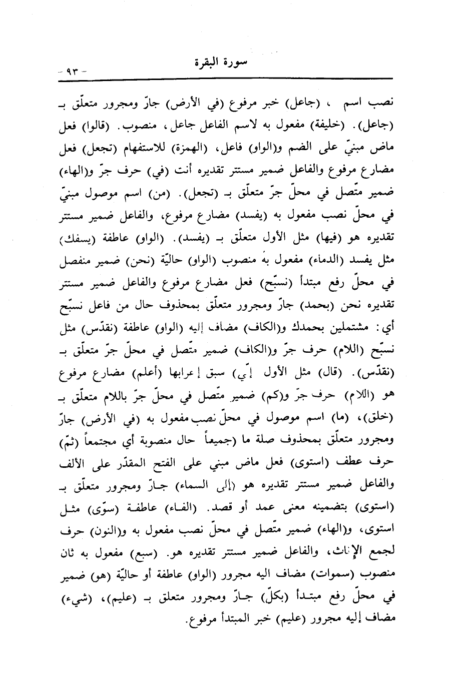 نصب اسم، (جاعل) خبر مرفوع (في الأرض) جارّ ومجرور متعلّق ب (جاعل) . (خليفة) مفعول به لاسم الفاعل جاعل، منصوب. (قالوا) فعل ماض مبنيّ على الضم و (الواو) فاعل، (الهمزة) للاستفهام (تجعل) فعل مضارع مرفوع والفاعل ضمير مستتر تقديره أنت (في) حرف جرّ و (الهاء) ضمير متّصل في محلّ جرّ متعلّق ب (تجعل) . (من) اسم موصول مبنيّ في محلّ نصب مفعول به (يفسد) مضارع مرفوع، والفاعل ضمير مستتر تقديره هو (فيها) مثل الأول متعلّق ب (يفسد) . (الواو) عاطفة (يسفك) مثل يفسد (الدماء) مفعول به منصوب (الواو) حاليّة (نحن) ضمير منفصل في محلّ رفع مبتدأ (نسبّح) فعل مضارع مرفوع والفاعل ضمير مستتر تقديره نحن (بحمد) جارّ ومجرور متعلّق بمحذوف حال من فاعل نسبّح أي: مشتملين بحمدك و (الكاف) مضاف إليه (الواو) عاطفة (نقدّس) مثل نسبّح (اللام) حرف جرّ و (الكاف) ضمير متّصل في محلّ جرّ متعلّق ب (نقدّس) . (قال) مثل الأول (إنّي) سبق إعرابها (أعلم) مضارع مرفوع هو (اللام) حرف جرّ و (كم) ضمير متّصل في محلّ جرّ باللام متعلّق ب (خلق) ، (ما) اسم موصول في محلّ نصب مفعول به (في الأرض) جارّ ومجرور متعلّق بمحذوف صلة ما (جميعا) حال منصوبة أي مجتمعا (ثمّ) حرف عطف (استوى) فعل ماض مبني على الفتح المقدّر على الألف والفاعل ضمير مستتر تقديره هو (إلى السماء) جارّ ومجرور متعلّق ب (استوى) بتضمينه معنى عمد أو قصد. (الفاء) عاطفة (سوّى) مثل استوى، و (الهاء) ضمير متّصل في محلّ نصب مفعول به و (النون) حرف لجمع الإناث، والفاعل ضمير مستتر تقديره هو. (سبع) مفعول به ثان منصوب (سموات) مضاف اليه مجرور (الواو) عاطفة أو حاليّة (هو) ضمير في محلّ رفع مبتدأ (بكلّ) جارّ ومجرور متعلق ب (عليم) ، (شيء) مضاف إليه مجرور (عليم) خبر المبتدأ مرفوع.