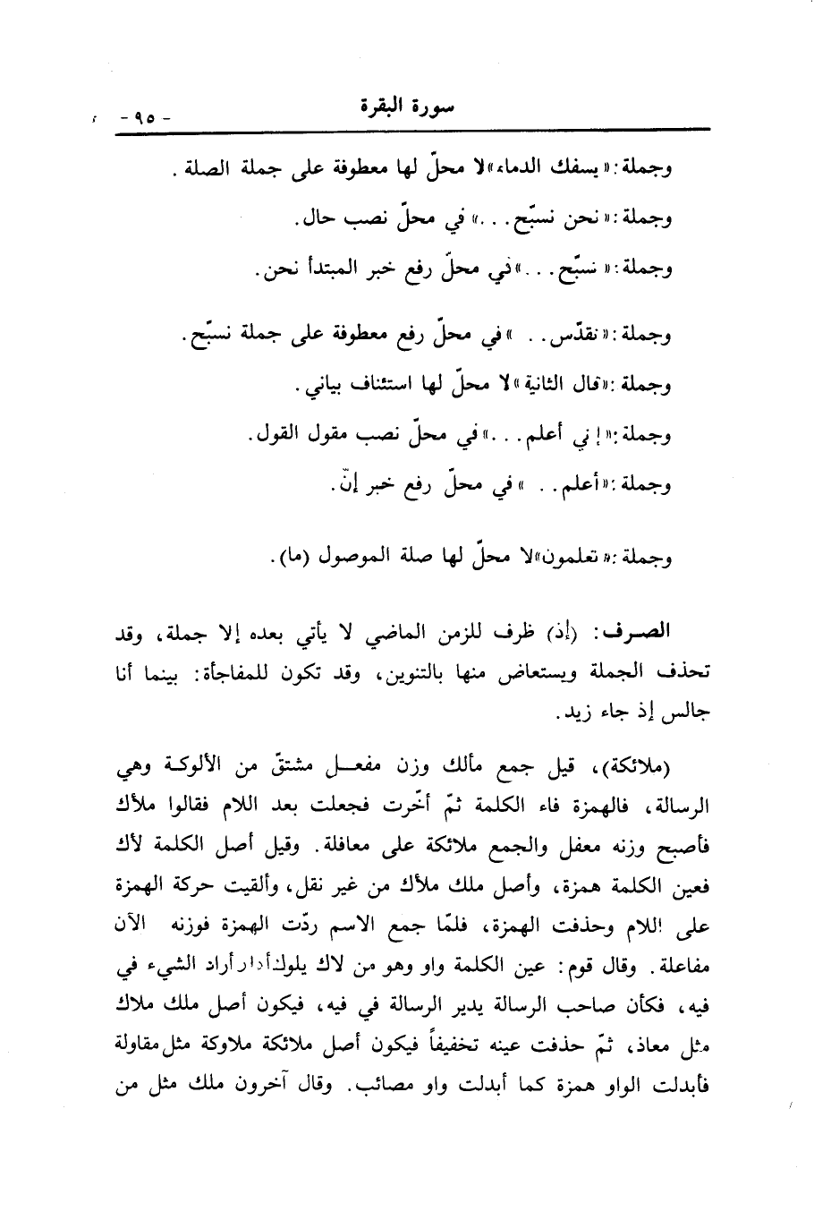 (ملائكة) ، قيل جمع مألك وزن مفعل مشتقّ من الألوكة وهي الرسالة، فالهمزة فاء الكلمة ثمّ أخّرت فجعلت بعد اللام فقالوا ملأك فأصبح وزنه معفل والجمع ملائكة على معافلة. وقيل أصل الكلمة لأك فعين الكلمة همزة، وأصل ملك ملأك من غير نقل، وألقيت حركة الهمزة على اللام وحذفت الهمزة، فلمّا جمع الاسم ردّت الهمزة فوزنه الآن مفاعلة. وقال قوم: عين الكلمة واو وهو من لاك يلوك أدار أراد الشيء في فيه، فكأن صاحب الرسالة يدير الرسالة في فيه، فيكون أصل ملك ملاك مثل معاذ، ثمّ حذفت عينه تخفيفا فيكون أصل ملائكة ملاوكة مثل مقاولة فأبدلت الواو همزة كما أبدلت واو مصائب. وقال آخرون ملك مثل من