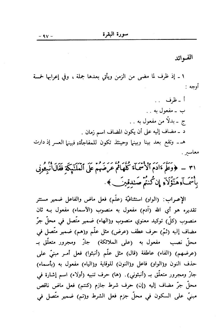(الواو) استئنافيّة (علّم) فعل ماض والفاعل ضمير مستتر تقديره هو أي الله (آدم) مفعول به منصوب (الأسماء) مفعول به ثان منصوب (كلّ) توكيد معنوي منصوب و (الهاء) ضمير متّصل في محلّ جرّ مضاف إليه (ثمّ) حرف عطف (عرض) مثل علّم و (هم) ضمير متّصل في محلّ نصب مفعول به (على الملائكة) جارّ ومجرور متعلّق ب (عرضهم) (الفاء) عاطفة (قال) مثل علّم (أنبئوا) فعل أمر مبنيّ على حذف النون و (الواو) فاعل و (النون) للوقاية و (الياء) مفعول به (بأسماء) جارّ ومجرور متعلّق ب (أنبئوني) . (ها) حرف تنبيه (أولاء) اسم إشارة في محلّ جرّ مضاف إليه (إن) حرف شرط جازم (كنتم) فعل ماض ناقص مبنيّ على السكون في محلّ جزم فعل الشرط و (تم) ضمير متّصل في