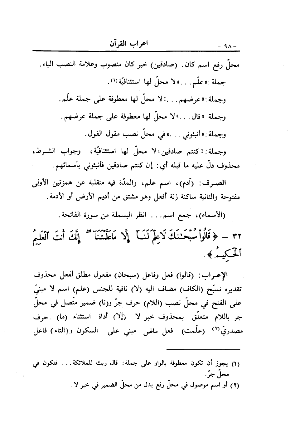 (قالوا) فعل وفاعل (سبحان) مفعول مطلق لفعل محذوف تقديره نسبّح (الكاف) مضاف اليه (لا) نافية للجنس (علم) اسم لا مبنيّ على الفتح في محلّ نصب (اللام) حرف جرّ و (نا) ضمير متّصل في محلّ جر باللام متعلّق بمحذوف خبر لا (إلا) أداة استثناء (ما) حرف مصدريّ «2» (علّمت) فعل ماض مبني على السكون و (التاء) فاعل