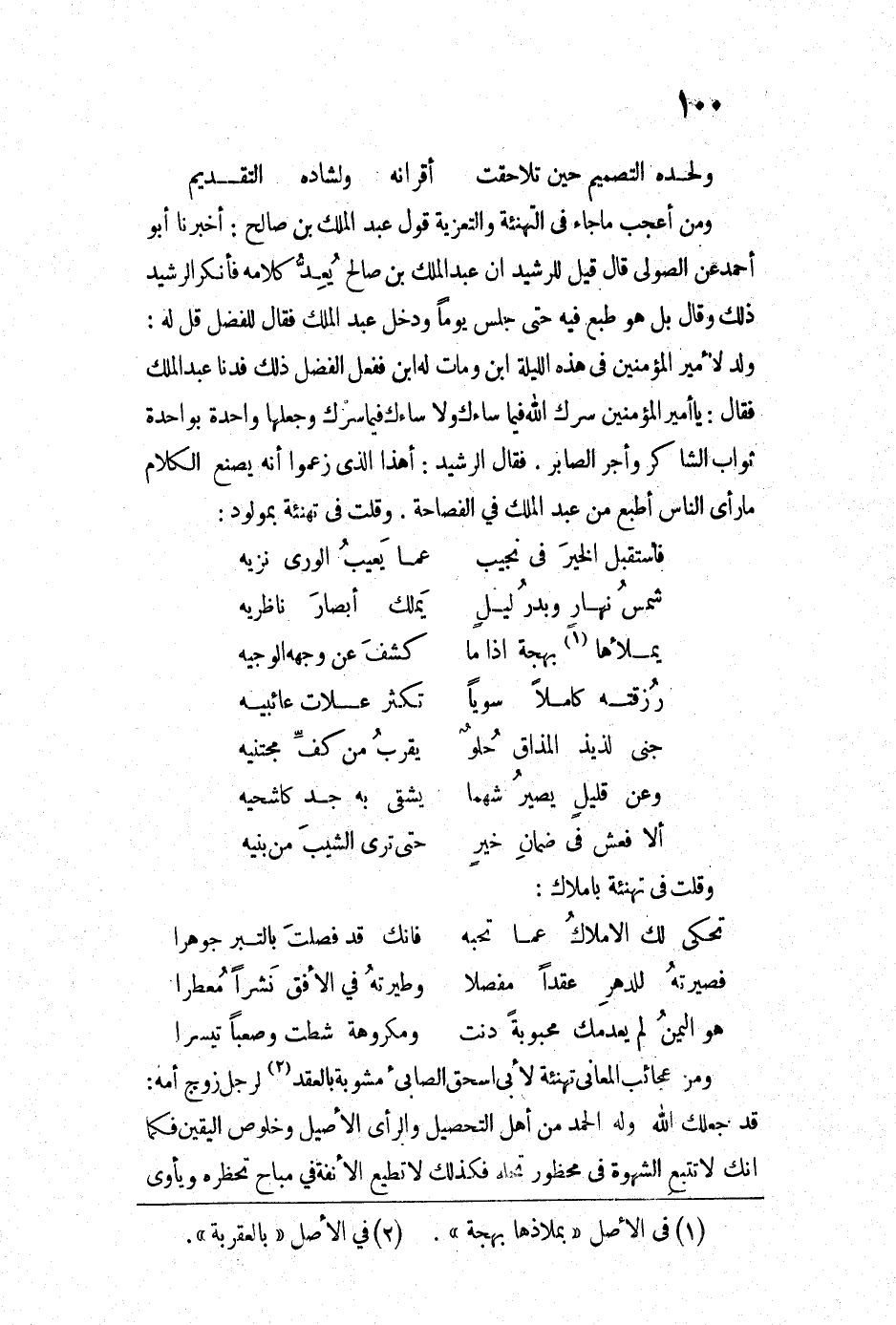 أخبرنا أبو أحمد عن الصولي قال قيل للرشيد إن عبد الملك بن صالح يُعدُ كلامه فأنكر الرشيد ذلك وقال بل هو طبع فيه حتى جلس يوماً ودخل عبد الملك فقال للفضل قل له: ولد لأمير المؤمنين في هذه الليلة ابن ومات له ابن ففعل الفضل ذلك فدنا عبد الملك فقال: يا أمير المؤمنين سرك الله فيما ساءك ولا ساءك فيما سرك وجعلها واحدة بواحدة ثواب الشاكر وأجر الصابر. فقال الرشيد: أهذا الذي زعموا أنه يصنع الكلام ما رأى الناس أطبع من عبد الملك في الفصاحة. وقلت في تهنئة بمولود: