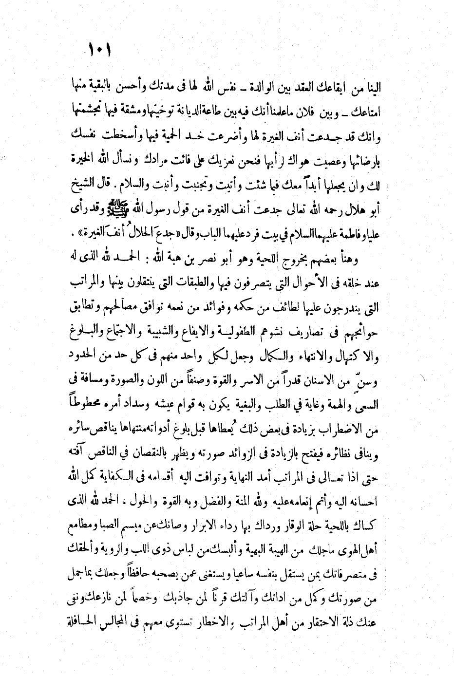 إلينا من إيقاعك بين الوالدة نفس الله لها في مدتك وأحسن بالبقية منها امتاعك وبين فلان ما علمنا أنك فيه بين طاعة الديانة توخينها ومشقة فيها تجشمنها وانك قد جدعت أنف الغيرة لها وأضرعت خد الحمية فيها وأسخطت نفسك بارضائها وعصيت هواك لرأيها فنحن نعزيك على فائت مرادك ونسأل الله الخيرة لك وان يجعلها أبداً معك فيما شئت وأتيت وتجنبت وأنبت والسلام. قال الشيخ أبو هلال رحمه الله تعالى جدعت أنف الغيرة من قول رسول الله & وقد رأى علياً وفاطمة عليهما السلام في بيت فرد عليها الباب وقال: (جدعَ الحلالُ أنفَ الغيرة) . وهنأ بعضهم بخروج اللحية وهو أبو نصر بن هبة الله: الحمد لله الذي له عند خلقه في الأحوال التي يتصرفون فيها والطبقات التي ينتقلون بينها والمراتب التي يندرجون عليها لطائف من حكمه وفوائد من نعمه توافق مصالحهم وتطابق حوائجهم في تصاريف نشوهم الطفولية والإيفاع والشبيبة والاجتماع والبلوغ والاكتهال والانتهاء والكمال وجعل لكل واحد منهم في كل حد من الحدود وسنٍ من الأسنان قدراً من الأسر والقوة وصنفاً من اللون والصورة ومسافةً في السعي والهمة وغايةً في الطلب والبغية يكون به قوام عيشه وسداد أمره محطوطاً من الاضطراب بزيادة في بعض ذلك يعطاها قبل بلوغ أدواته منتهاها يناقص سائره وينافي نظائره فيفتح بالزيادة في الزوائد صورته ويظهر بالنقصان في الناقص آفته حتى إذا تعالى في المراتب أمد النهاية وتوافت إليه أقسامه في الكفاية كمل الله إحسانه إليه وأتم إنعامه عليه ولله المنة والفضل وبه القوة والحول، الحمد لله الذي كساك باللحية حلة الوقار ورداك بها رداء الأبرار وصانك عن ميسم الصبا ومطامع أهل الهوى ماجلك من الهيبة البهية وألبسك من لباس ذوي اللب والروية وألحقك في متصرفاتك بمن يستقل بنفسه ساعيا ويستغني عمن يصحبه حافظاً وجعلك بما جمل من صورتك وكمل من اداتك وآلتك قرناً لمن جاذبك وخصماً لمن نازعك ونفى عنك ذلة الاحتقار من أهل المراتب والأخطار تسوى معهم في المجالس الحافلة