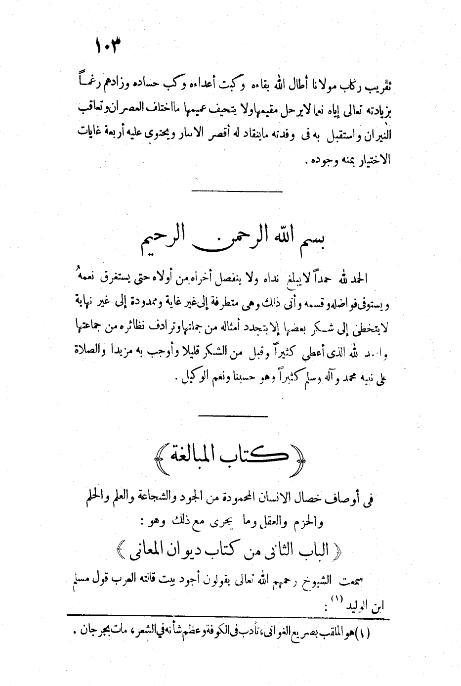 الحمد لله حمداً لا يبلغ نداه ولا ينفصل أخراه من أولاه حتى يستغرق نعمه ويستوفي فواضله وقسمه وأني ذلك وهي متطرفة إلى غير غاية وممدودة إلى غير نهاية لا يتخطى إلى شكر بعضها إلا بتجدد أمثاله من جملتها وترادف نظائره من جماعتها والحمد لله الذي أعطى كثيراً وقبل من الشكر قليلا وأوجب به مزيدا والصلاة على نبيه محمد وآله وسلم كثيراً وهو حسبنا ونعم الوكيل