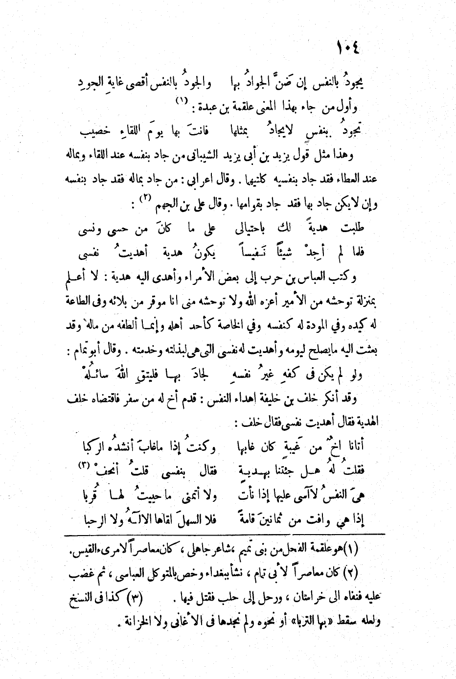 وهذا مثل قول يزيد بن أبي يزيد الشيباني من جاد بنفسه عند اللقاء وبماله عند العطاء فقد جاد بنفسيه كلتيهما وقال أعرابي من جاد بماله فقد جاد بنفسه وإن لا يكن جاد بها فقد جاد بقوامها. وقال علي بن الجهم: