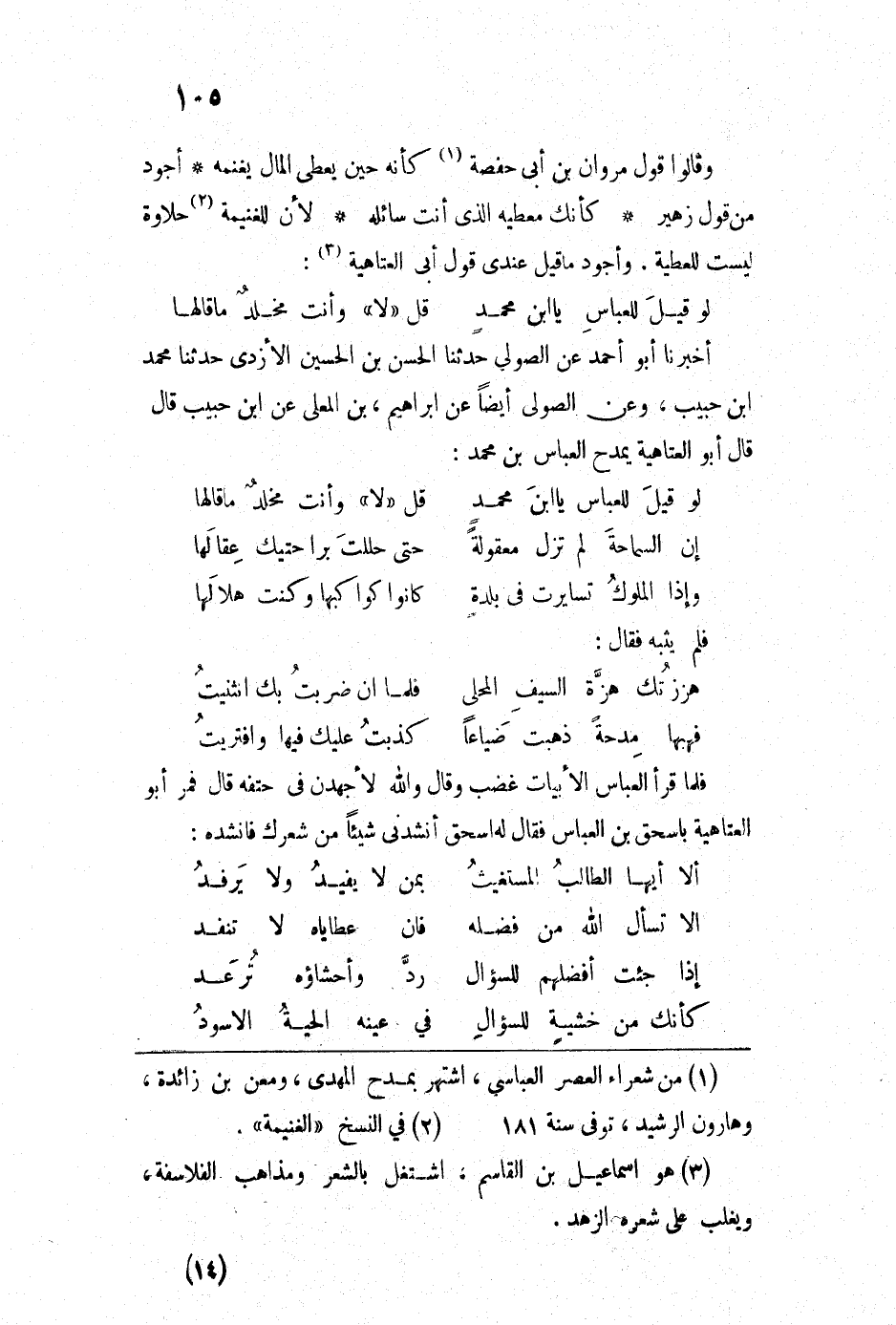 أخبرنا أبو أحمد عن الصولي حدثنا الحسن بن الحسين الأزدي حدثنا محمد ابن حبيب، وعن الصولي أيضاً عن إبراهيم، بن المعلى عن ابن حبيب قال قال أبو العتاهية يمدح العباس بن محمد: