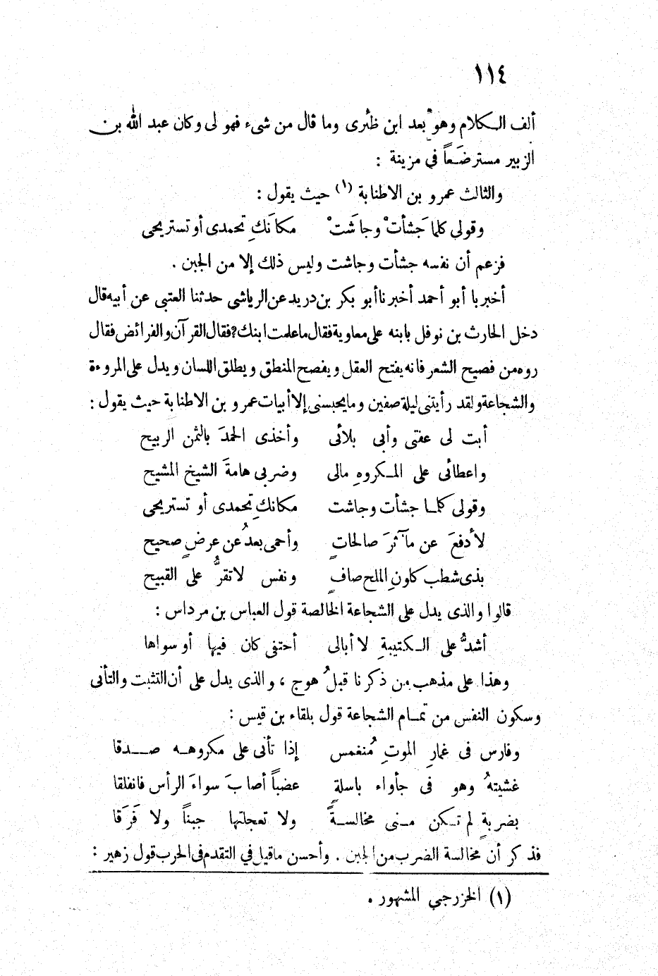 فزعم أن نفسه جشأت وجاشت وليس ذلك إلا من الجبن. أخبرنا أبو أحمد أخبرنا أبو بكر بن دريد عن الرياشي حدثنا العتبي عن أبيه قال دخل الحارث بن نوفل بابنه على معاوية فقال ما علمت ابنك؟ فقال القرآن والفرائض فقال روه من فصيح الشعر فإنه يفتح العقل ويفصح المنطق ويطلق اللسان ويدل على المروءة والشجاعة ولقد رأيتني ليلة صفين وما يحبسني ألا أبيات عمرو بن الأطنابة حيث يقول: