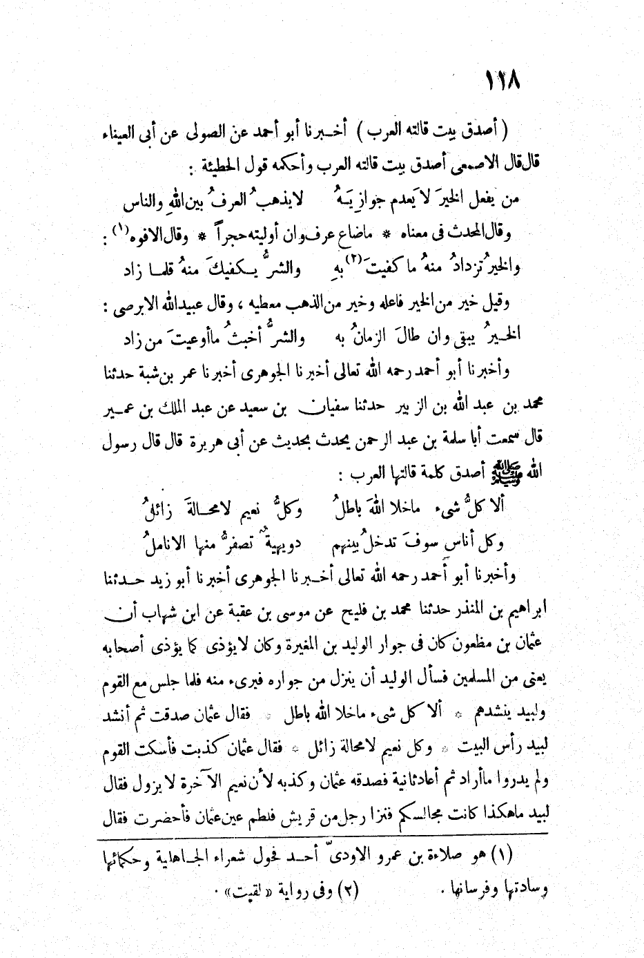وأخبرنا أبو أحمد رحمه الله تعالى أخبرنا الجوهري أخبرنا عمر بن شبة حدثنا محمد بن عبد الله بن الزبير حدثنا سفيان بن سعيد عن عبد الملك بن عمير قال سمعت أبا سلمة بن عبد الرحمن يحدث بحديث عن أبي هريرة قال قال رسول الله & أصدق كلمة قالتها العرب:
