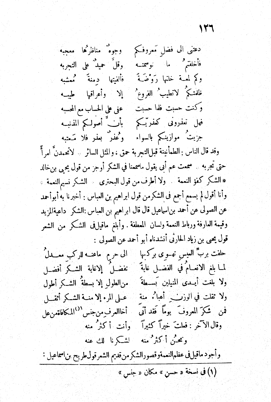 وأنا أقول لم يسمع أجمع في الشكر من قول إبراهيم بن العباس أخبرنا به أبو أحمد عن الصولي عن أحمد بن إسماعيل قال قال إبراهيم بن العباس الشكر داعية المزيد وقيمة العارفة ورباط النعمة ولسان المعطفة. وأبلغ ما قيل في الشكر من الشعر قول يحيى بن زياد الحارثي أنشدناه أبو أحمد عن الصولي: