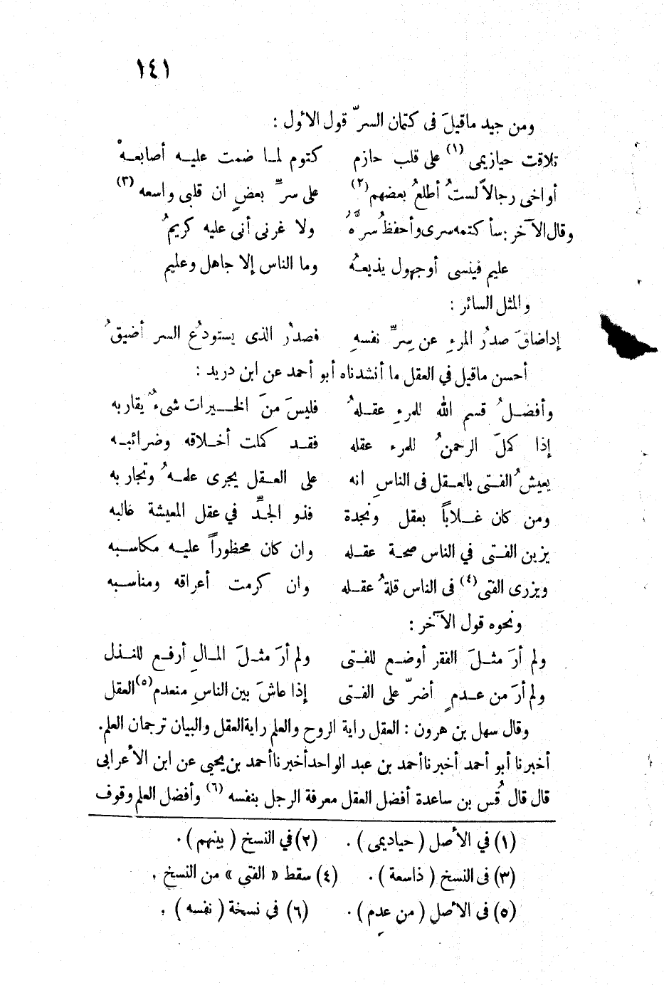 ومن جيد ما قيل في كتمان السر قول الأول: