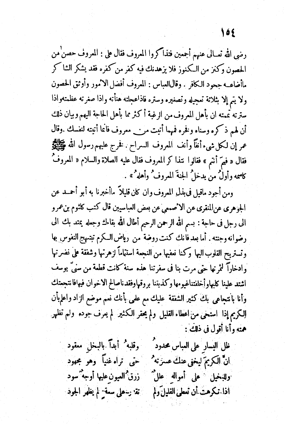 رضي الله تعالى عنهم أجمعين فتذاكروا المعروف فقال علي: المعروف حصن من الحصون وكنز من كنوز فلا يزهدنك فيه كفر من كفره فقد يشكر الشاكر ما أضاعه جحود الكافر. وقال العباس: المعروف أفضل الأمور وأوثق الحصون ولايتم إلا بثلاثة تعجليه وتصغيره وستره فإذا عجلته هنأته وإذا صغرته عظمته وإذا سترته تمته إن بأهل المعروف من الرغبة أكثر مما بأهل الحاجة إليهم وبيان ذلك أن لهم ذكره وسناه وفخره فمهما أتيت من معروف فإنما أتيته لنفسك. وقال عمر إن لكل شئ أنفاً وأنف المعروف السراح. فخرج عليهم رسول الله & فقال (فيم أنتم) فقالوا نتذاكر المعروف فقال عليه الصلاة والسلام (المعروف كاسمه وأولُ من يدخل الجنة المعروف وأهلهُ) . ومن أجود ما قيل في بذل المعروف وإن كان قليلاً ما