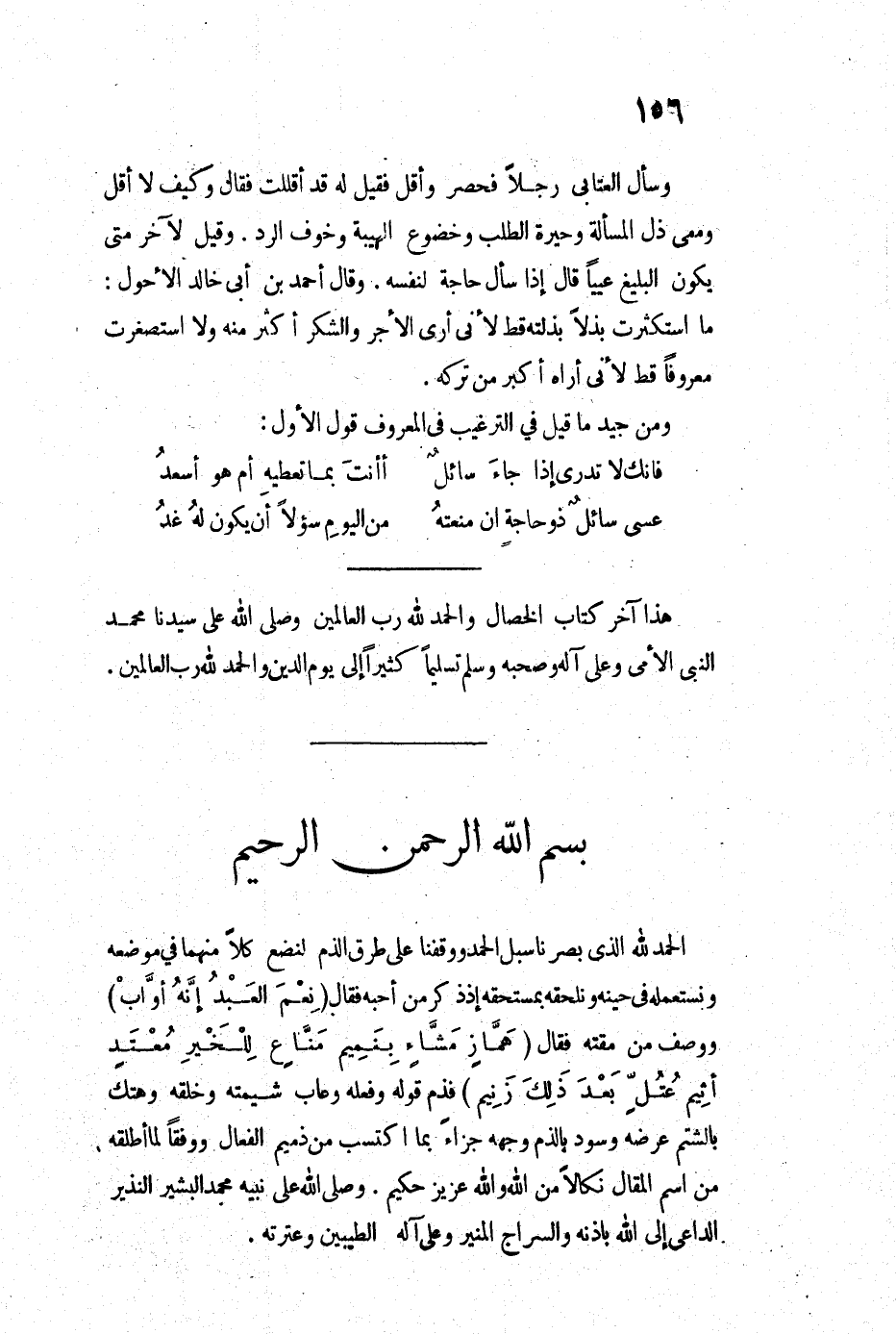 هذا آخر كتاب الخصال والحمد لله رب العالمين وصلى الله على سيدنا محمد النبي الأمي وعلى آله وصبحه وسلم تسليماً كثيراً إلى يوم الدين والحمد لله رب العالمين. بسم الله الرحمن الرحيم الحمد لله الذي بصرنا سبل الحمد ووفقنا على طرق الذم لنضع كلاً منهما في موضعه ونستعمله في حينه ونلحقه بمستحقه إذ ذكر من أحبه فقال {نعم العبد إنه أواب} ووصف من مقته فقال {همازٍ مشاءٍ بنميم مناعٍ للخير معتدٍ أثيم عتلٍ بعد ذلك زنيم} فذم قوله وفعله وعاب شيمته وخلقه وهتك بالشتم عرضه وسود بالذم وجهه جزاءً بما اكتسب من ذميم الفعال ووفقاً لما أطلقه من اسم المقال نكالاً من الله والله عزيز حكيم. وصلى الله على نبيه محمد البشير النذير الداعي إلى الله باذنه والسراج المنير وعلى آله الطيبين وعترته.