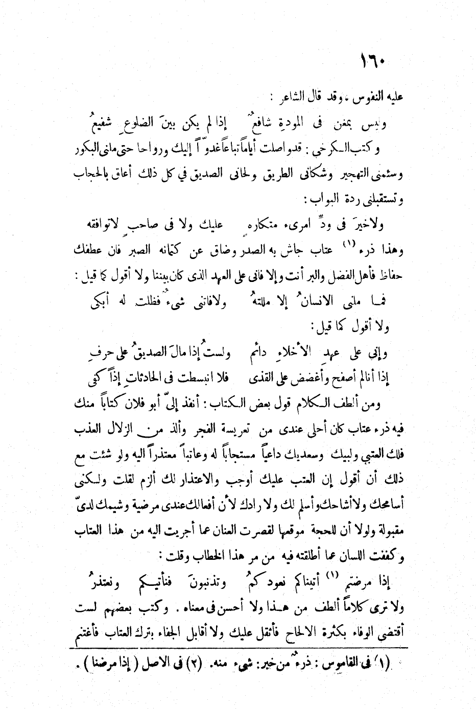 وهذا ذرء عتاب جاش به الصدر وضاق عن كتمانة الصبر فإن عطفك حفاظ فأهل الفضل والبر أنت وإلا فإني على العهد الذي كان بيننا ولا أقول كما قيل:
