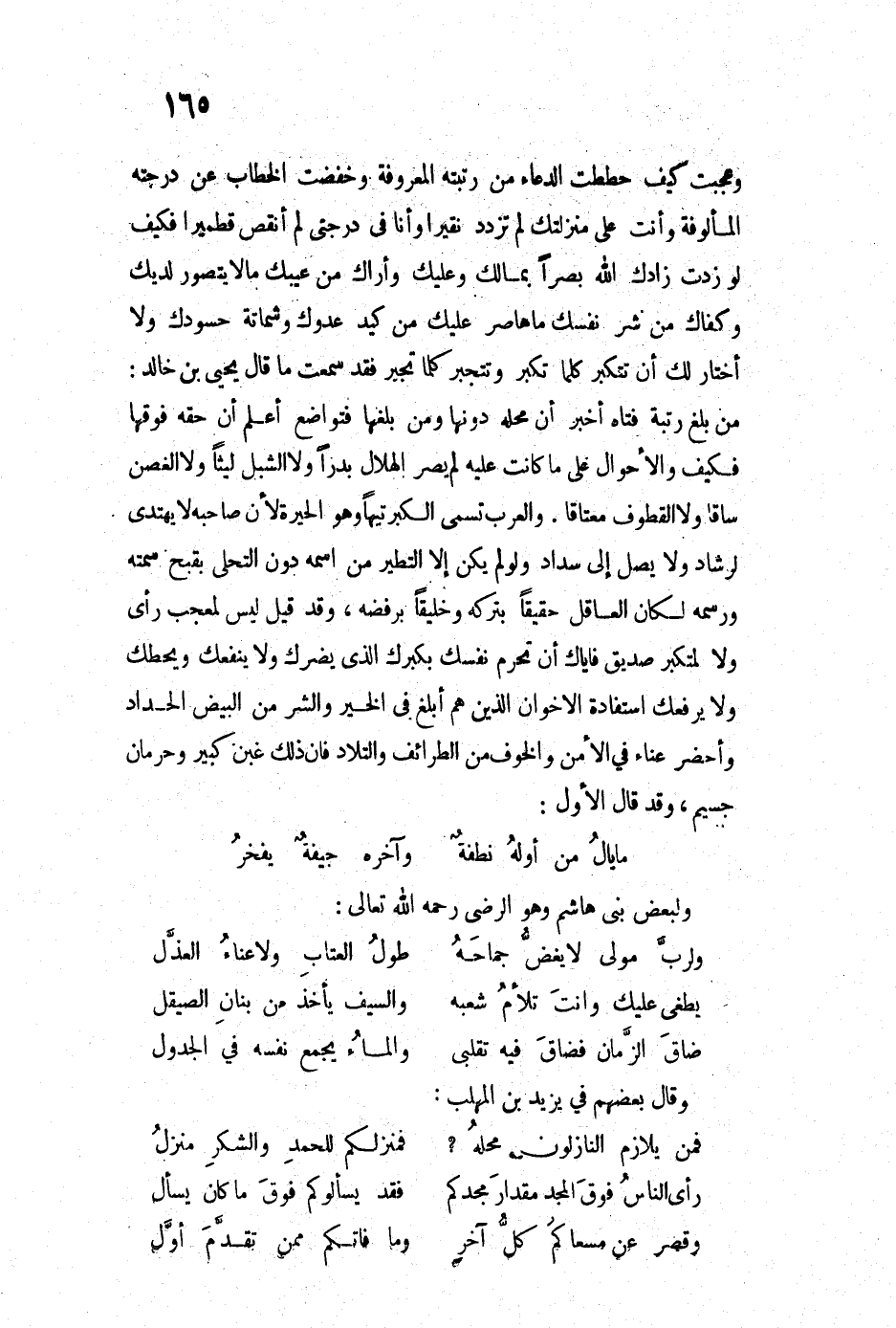 وعجبت كيف حططت الدعاء من رتبته المعروفة وخفضت الخطاب عن درجته المألوفة وأنت على منزلتك لم تزدد نقيرا وأنا في درجتي لم أنقص قطميرا فكيف لو زدت زادك الله بصراً بمالك وعليك وأراك من عيبك مالا يتصور لديك وكفاك من شر نفسك ما هاصر عليك من كيد عدوك وشماتة حسودك ولا أختار لك أن تتكبر كلما تكبر وتتجبر كلما تجبر فقد سمعت ما قال يحيى بن خالد: من بلغ رتبة فتاه أخبر أن محله دونها ومن بلغها فتواضع أعلم أن حقه فوقها فكيف والأحوال على ما كانت عليه لم يصر الهلال بدراً ولا الشبل ليثاً ولا الغصن ساقاً ولا القطوف معتاقاً. والعرب تسمى الكبر تيهاً وهو الحيرة لأن صاحبه لا يهتدي لرشاد ولا يصل إلى سداد ولو لم يكن إلا التطير من اسمه دون التحلي بقبح سمته ورسمه لكان العاقل حقيقاً بتركه وخليقاً برفضه، وقد قيل ليس لمعجب رأي ولا لمتكبر صديق فإياك أن تحرم نفسك بكبرك الذي يضرك ولا ينفعك ويحطك ولا يرفعك استفادة الإخوان الذين هم أبلغ في الخير والشر من البيض الحداد وأحضر عناء في الأمن والخوف من الطرائف والتلاد فإن ذلك غبن كبير وحرمان جسيم، وقد قال الأول: