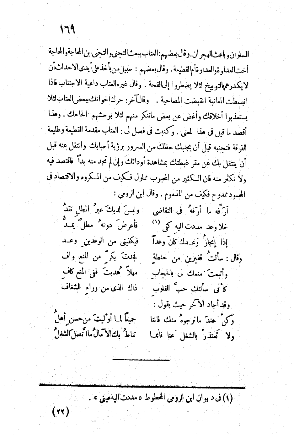 السلوان وباعث الهجران. وقال بعضهم: العتاب يبعث التجني والتجني ابن المحاجة والمحاجة أخت العداوة والعداوة أم القطيعة. وقال بعضهم: سبيل من يأخذ على أيدي الأحداث أن لا يكدرهم بالتوبيخ لئلا يضطروا إلى القحة. وقال غيره العتاب داعية الإجتناب فإذا انبسطت المعاتبة انقبضت المصاحبة. وقال آخر: حرك إخوانك ببعض العتاب لئلا يستعذبوا أخلاقك وأغض عن بعض ما تنكر منهم لئلا يوحشهم إلحاحك. وهذا أقصد ما قيل في هذا المعنى. وكتبت في فصل لي: العتاب مقدمة القطيعة وطليعة الفرقة فتجنبه قبل أن يجنبك حظك من السرور برؤية أحبابك وانتقل عنه قبل أن ينتقل بك عن مقر غبطتك بمشاهدة أودائك وإن لم تجد منه أبداً فاقتصد فيه ولا تكثر منه فإن الكثير من المحبوب مملول فكيف من المكروه والإقتصاد في المحمود ممدوح فكيف من المذموم. وقال ابن الرومي: