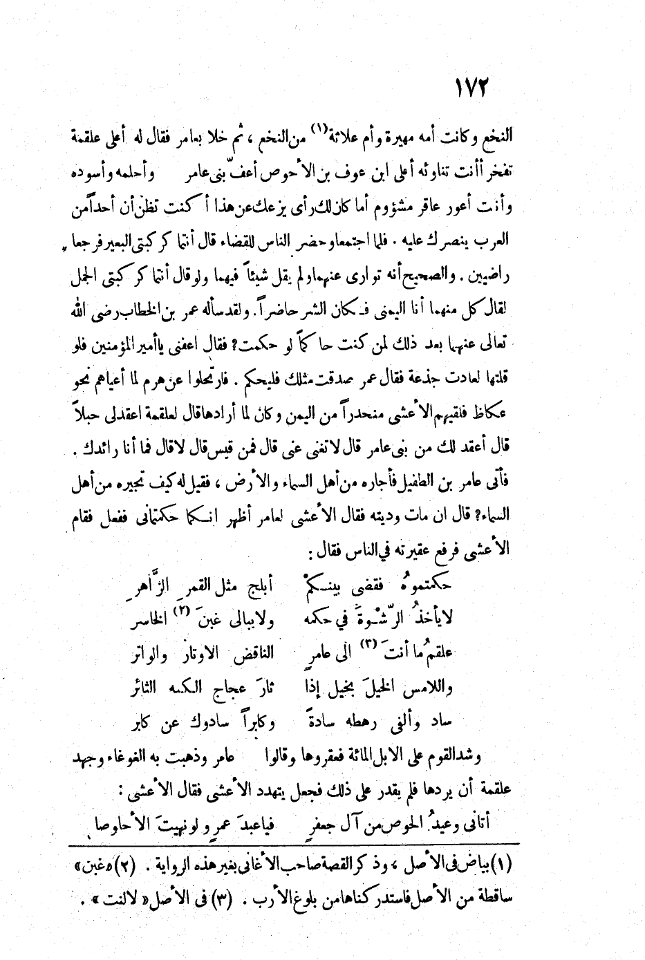النخع وكانت أمه مهيرة وأم علاثة من النخع، ثم خلا بعامر فقال له أعلى علقمة تفخر أأنت تناوئه أعلى ابن عوف بن الأحوص أعف بن عامر وأحلمه وأسوده وأنت أعور عاقر مشؤوم أما كان لك رأى يزعك عن هذا أكنت تظن أن أحداً من العرب ينصرك عليه. فلما اجتمعا وحضر الناس للقضاء قال أنتما كركبتي البعير فرجعا راضين والصحيح أنه توارى عنهما ولم يقل شيئاً فيها ولو قال أنتما كركبتي الجمل لقال كل منهما أنا اليمنى فكان الشر حاضراً. ولقد سأله عمر بن الخطاب رضي الله تعالى عنهما بعد ذلك لمن كنت حاكماً لو حكمت؟ فقال أعفني يا أمير المؤمنين فلو قلتها لعادت جذعة فقال عمر صدقت مثلك فليحكم. فارتحلوا عن هرم لما أعياهم نحو عكاظ فلقيهم الأعشى منحدراً من اليمن وكان لما أرادها قال لعلقمة اعقد لي حبلاً قال أعقد لك من بني عامر قال لا تغني عني قال فمن قيس قال لا قال فما أنا رائدك. فأتى عامر بن الطفيل فأجاره من أهل السماء والأرض، فقيل له كيف تجيره من أهل السماء؟ قال إن مات وديته فقال الأعشى لعامر أظهر انكما حكمتماني ففعل فقام الأعشى فرفع عقيرته في الناس فقال:
