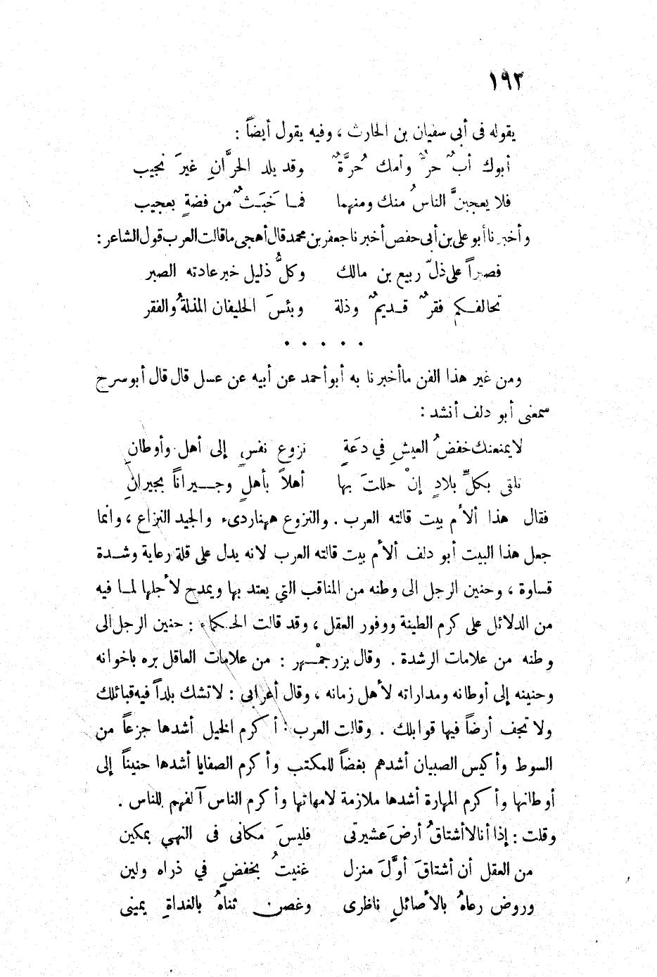 فقال هذا الأم بيت قالته العرب. والنزوع ههنا ردئ والجيد النزاع، وإنما جعل هذا البيت أبو دلف ألأم بيت قالته العرب لأنه يدل على قلة رعاية وشدة قساوة، وحنين الرجل إلى وطنه من المناقب التي يعتد بها ويمدح لأجلها لما فيه من الدلائل على كرم الطينة ووفور العقل، وقد قالت الحكماء: حنين الرجل إلى وطنه من علامات الرشدة. وقال بزرجمهر: من علامات العاقل بره بإخوانه وحنينه إلى أوطانه ومداراته لأهل زمانه، وقال أعرابي: لا تشك بلداً فيه قبائلك ولا تجف أرضاً فيها قوابلك وقالت العرب: أكرم الخيل أشدها جزعاً من السوط وأكيس الصبيان أشدهم بغضاً للمكتب وأكرم الصفايا أشدها حنيناً إلى أوطانها وأكرم المهارة أشدها ملازمة لأمهاتها وأكرم الناس آلفهم للناس. وقلت: