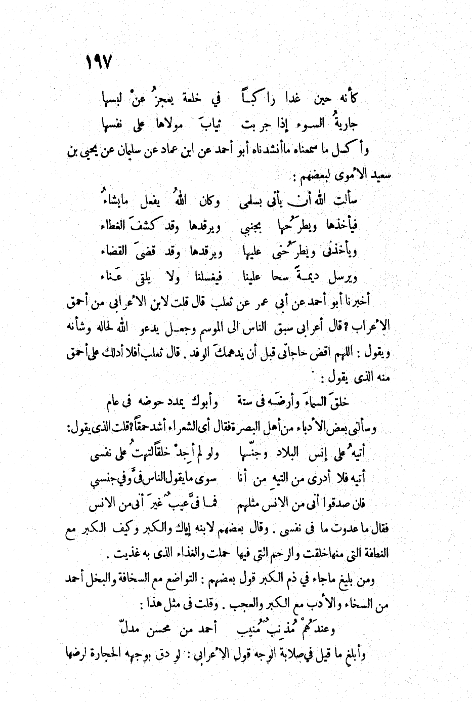 أخبرنا أبو أحمد عن أبي عمر عن ثعلب قال قلت لابن الأعرابي من أحمق الأعراب؟ قال أعرابي سبق الناس إلى الموسم وجعل يدعو الله لحاله وشأنه ويقول: اللهم اقض حاجاتي قبل أن يدهمك الوفد. قال ثعلب أفلا أدلك على أحمق منه الذي يقول: