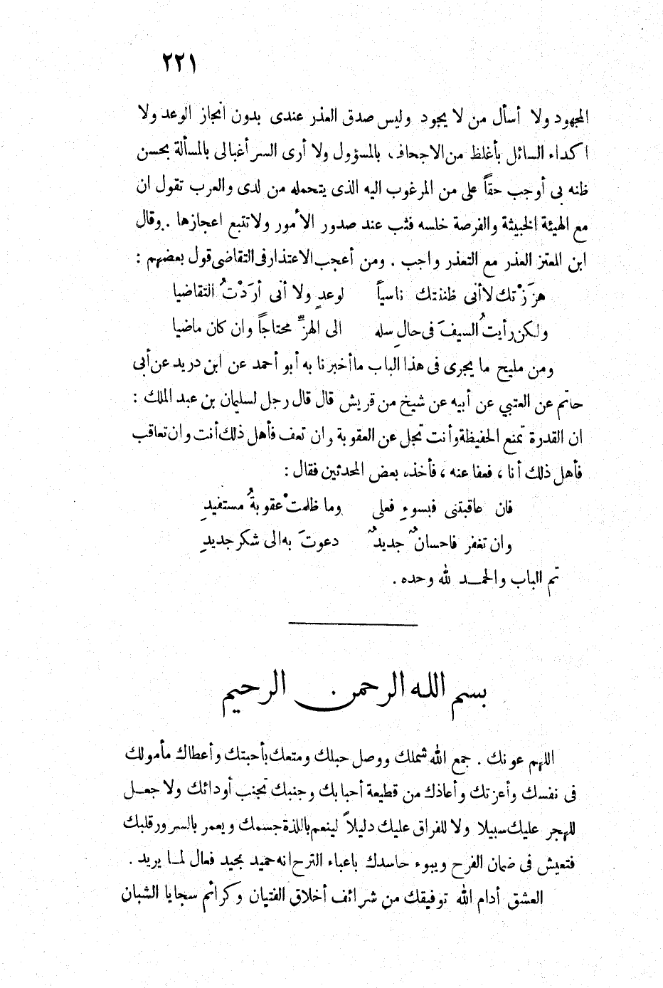 تم الباب والحمد لله وحده بسم الله الرحمن الرحيم اللهم عونك. جمع الله شملك ووصل حبلك ومتعك بأحبتك وأعطاك مأمولك في نفسك وأعزتك وأعذاك من قطيعة أحبابك وجنبك تجنب أودائك ولا جعل للهجر عليك سبيلا ولا للفراق عليك دليلاً لينعم باللذة جسمك ويعمر بالسرور قلبك فتعيش في ضمان الفرح ويبوء حاسدك باعباء الترح إنه حميد مجيد فعال لما يريد. العشق أدام الله توفيقك منشرائف أخلاق الفتيان وكرائم سجايا الشبان