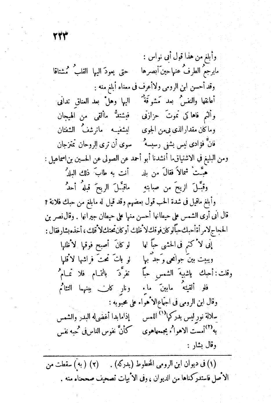 وأبلغ ما قيل في شدة الحب قول بعضهم وقد قيل له ما بلغ من حبك فلانة قال إني أرى الشمس على حيطانها أحسن منها على حيطان جيرانها. وقال نصر بن الحجاج لامرأة أحبك حباً لوكان فوقك لأظلك أوكان تحتك لأقلك، أخذه بشار فقال: