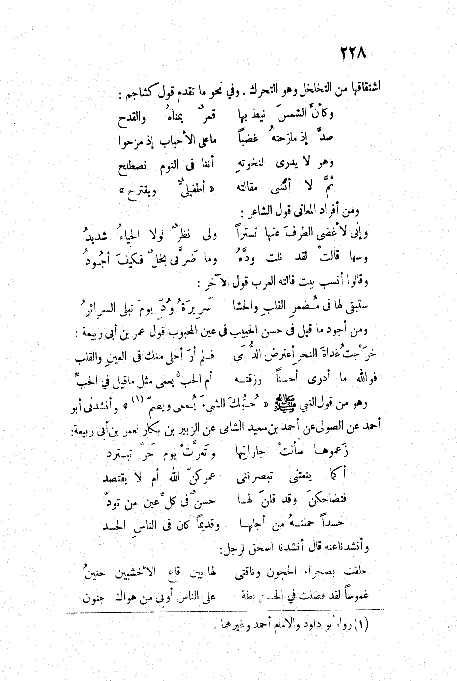 وهو من قول النبي & (حبكَ الشئ يُعمي ويصمّ) وأنشدني أبو أحمد عن الصولي عن أحمد بن سعيد الشامي عن الزبير بن بكار لعمر بن أبي ربيعة: