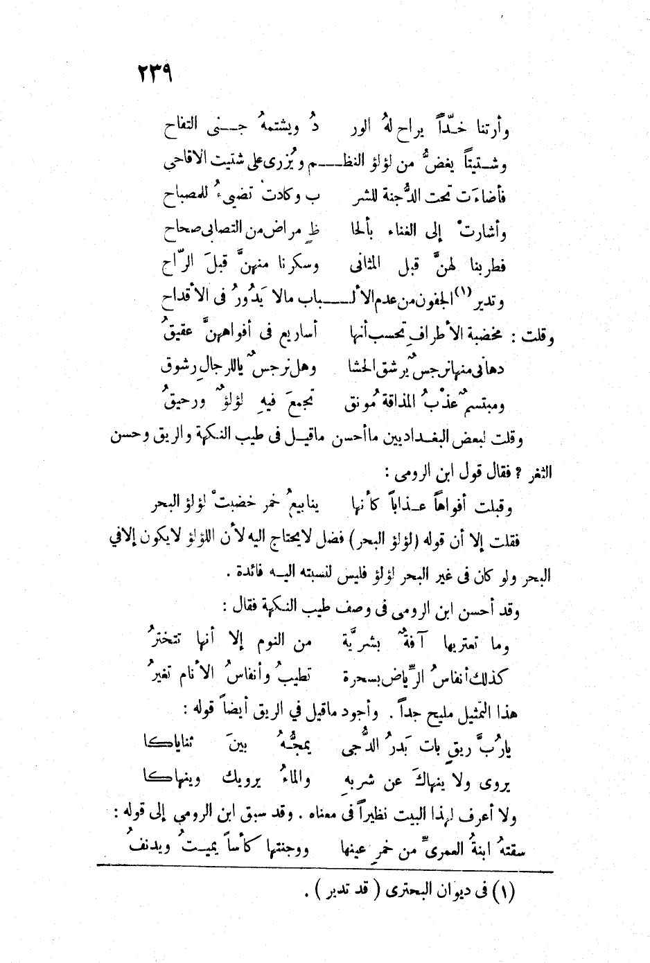 فقلت إلا أن قوله لؤلؤ البحر فضل لا يحتاج إليه لأن اللؤلؤ لا يكون إلا في البحر ولو كان في غير البحر لؤلؤ فليس لنسبته إليه فائدة. وقد أحسن ابن الرومي في وصف طيب النكهة فقال: