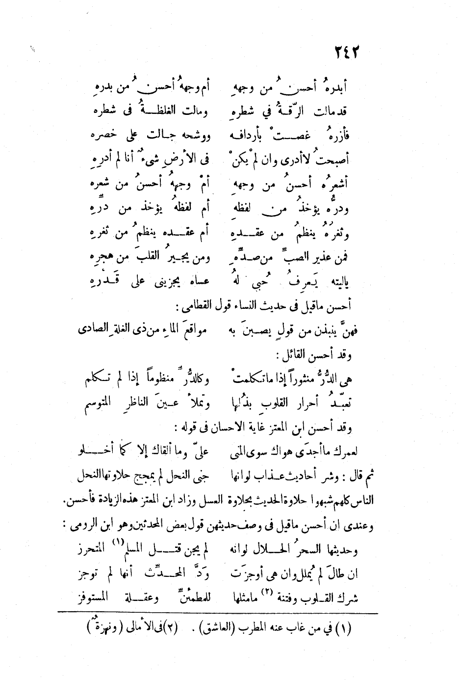 الناس كلهم شبهوا حلاوة الحديث بحلاوة العسل وزاد ابن المعتز هذه الزيادة فأحسن. وعندي أن أحسن ما قيل في وصف حديثهن قول بعض المحدثين وهو ابن الرومي: