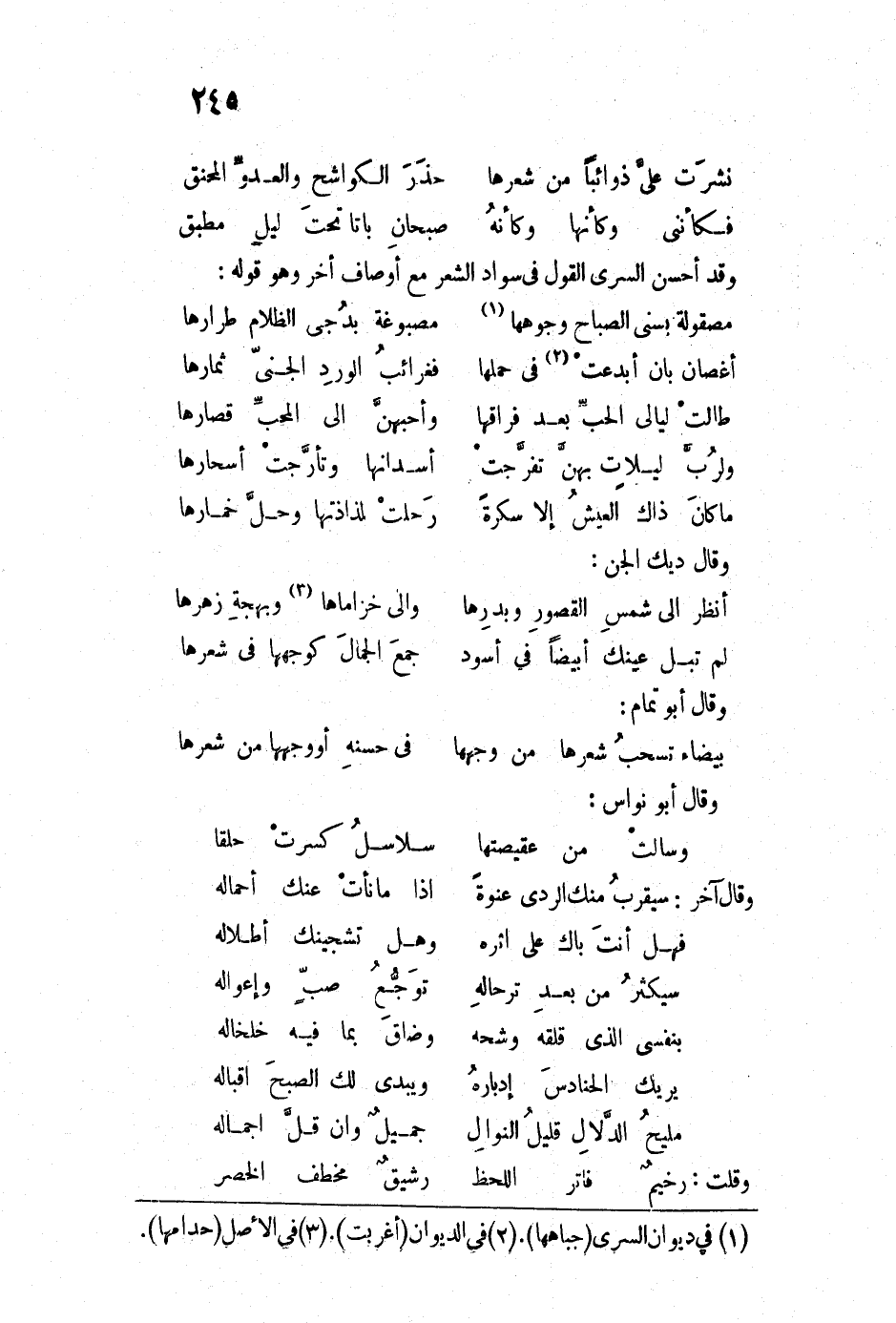 وقد أحسن السري القول في سواد الشعر مع أوصاف أخر وهو قوله: