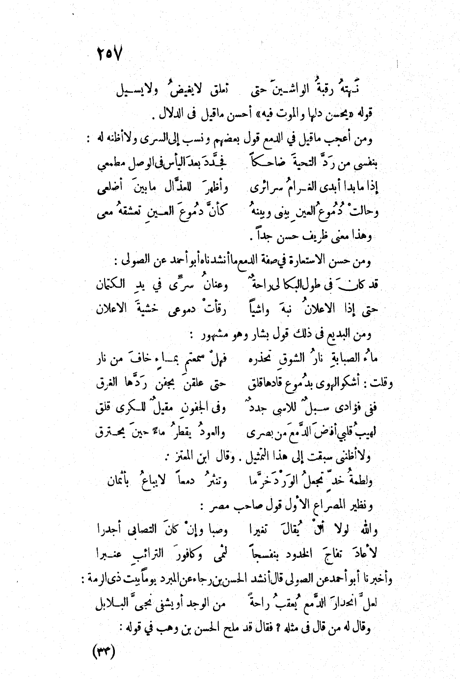 وهذا معنى ظريف حسن جداً. ومن حسن الاستعارة في صفة الدمع ما أنشدناه أبو أحمد عن الصولي: